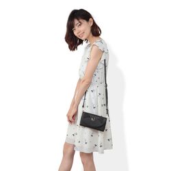 - Сумка-клатч с функцией кошелька – также, как и сумки-вёдра, укомплектована ремешком через плечо и небольшой ручкой. Как и в предыдущем случае, оба варианта декорированы ушками и металлическими полумесяцами золотистого цвета. Внутри – карман на молнии (замок декорирован золотистой звёздочкой), а также множество отделений для хранения карт. Размер – 11 см. х 20 см. х 3 см. Цена – 7800 йен.