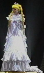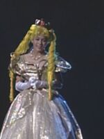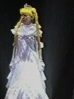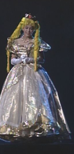 В Серебряном миллениуме Принцесса Серенити носила вот такое помпезное платье (мы помним, что создатели первого мюзикла придерживались той версии, что костюмы должны были быть хорошо видны даже с самого последнего ряда). На голове у Серенити золотая корона. Так Принцесса выглядела в мюзиклах "Gaiden – Dark Kingdom Fukkatsu Hen", "Gaiden – Dark Kingdom Fukkatsu Hen - Kaiteiban", а также "Usagi – Ai no Senshi e no Michi", но только без короны. -