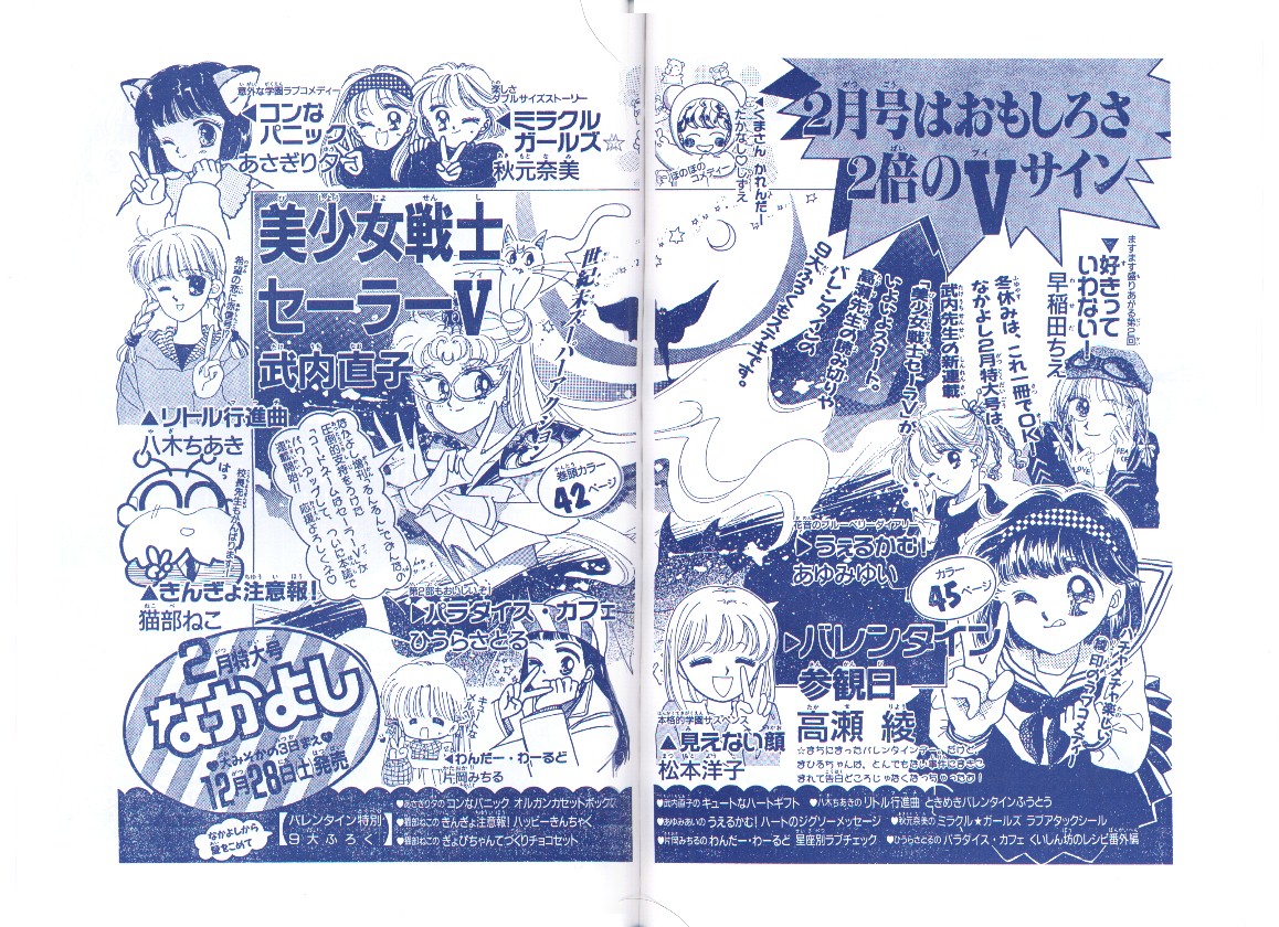 Обзорные страницы январского выпуска Накаёси 1992. Произошли некоторые перемены: девочку теперь зовут Усаги, кота Артемис, костюм Усаги похож на костюм Сейлор Ви, название манги выглядит как "Прекрасная девочка-воин Сейлор Ви". Эти изменения произошли к тому времени, как появилась первая глава, в выпуске следующего месяца.