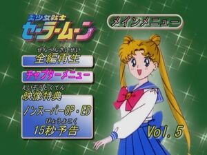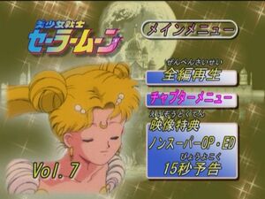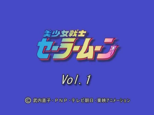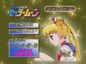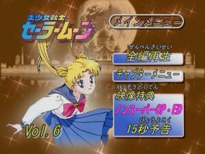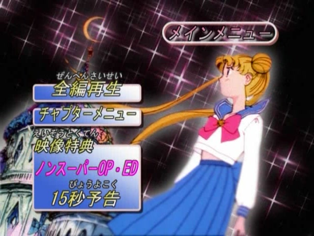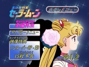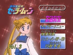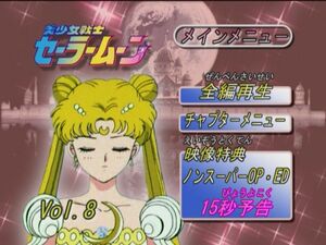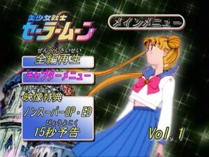 Когда появляется меню, мы видим Усаги на фоне дворца Серебряного Миллениума (но это характерно только для первого диска, ведь на каждый DVD фоновая картинка была своя). На заднем плане мерцают звезды (причем они меняют свой цвет). В верхнем левом углу в продолговатой рамочке мы видим надпись катаканой «Мэин Мэниюу» (main menu), а в нижнем правом - три блока с надписями. Через некоторое время появляется логотип «Bishoujo Senshi Sailor Moon» в верхнем левом углу и надпись «Vol. 1» в нижнем правом.