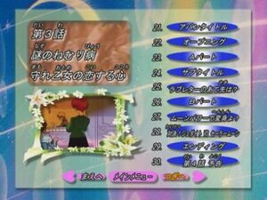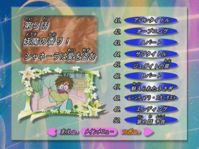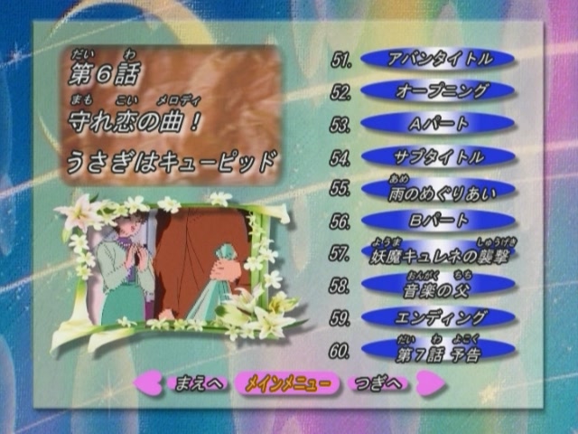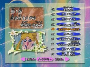 Пока мы рассматриваем main menu, проигрывается Moonlight Densetsu в аранжировке, немного отличной от той, что мы слышим в начале эпизода. Причем для каждого диска эта аранжировка разная (все они собраны в "Memorial Music Box - Disk 1", трек назвается "Miracle Romance"). Исключения составляют второй и пятый диски, там звучат Heart Moving и Princess Moon соответственно.