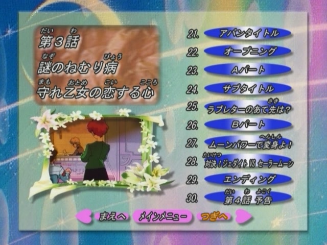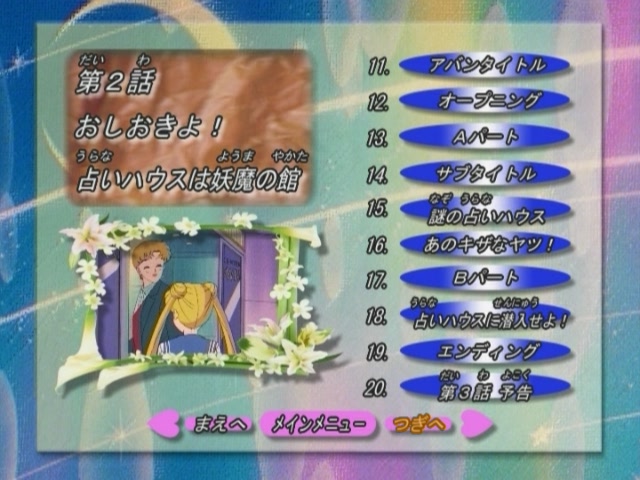 – Эпизод первый – «Великолепное перевоплощение плаксы Усаги». Внизу под этой надписью мы видим анимацию в рамке. Эта анимация – нарезка сцен из данной серии. Справа мы видим столбик с кнопками. Всего их по десять на каждой странице. Каждая кнопка ведет к определенному моменту серии. Разберем названия кнопок в «Меню эпизодов» на примере второй серии (так как первая особенная, и её меню отличается от остальных).