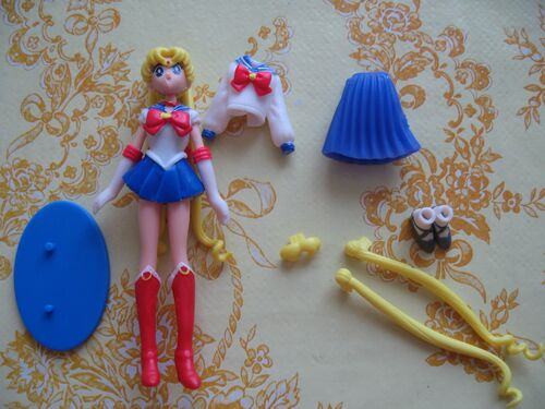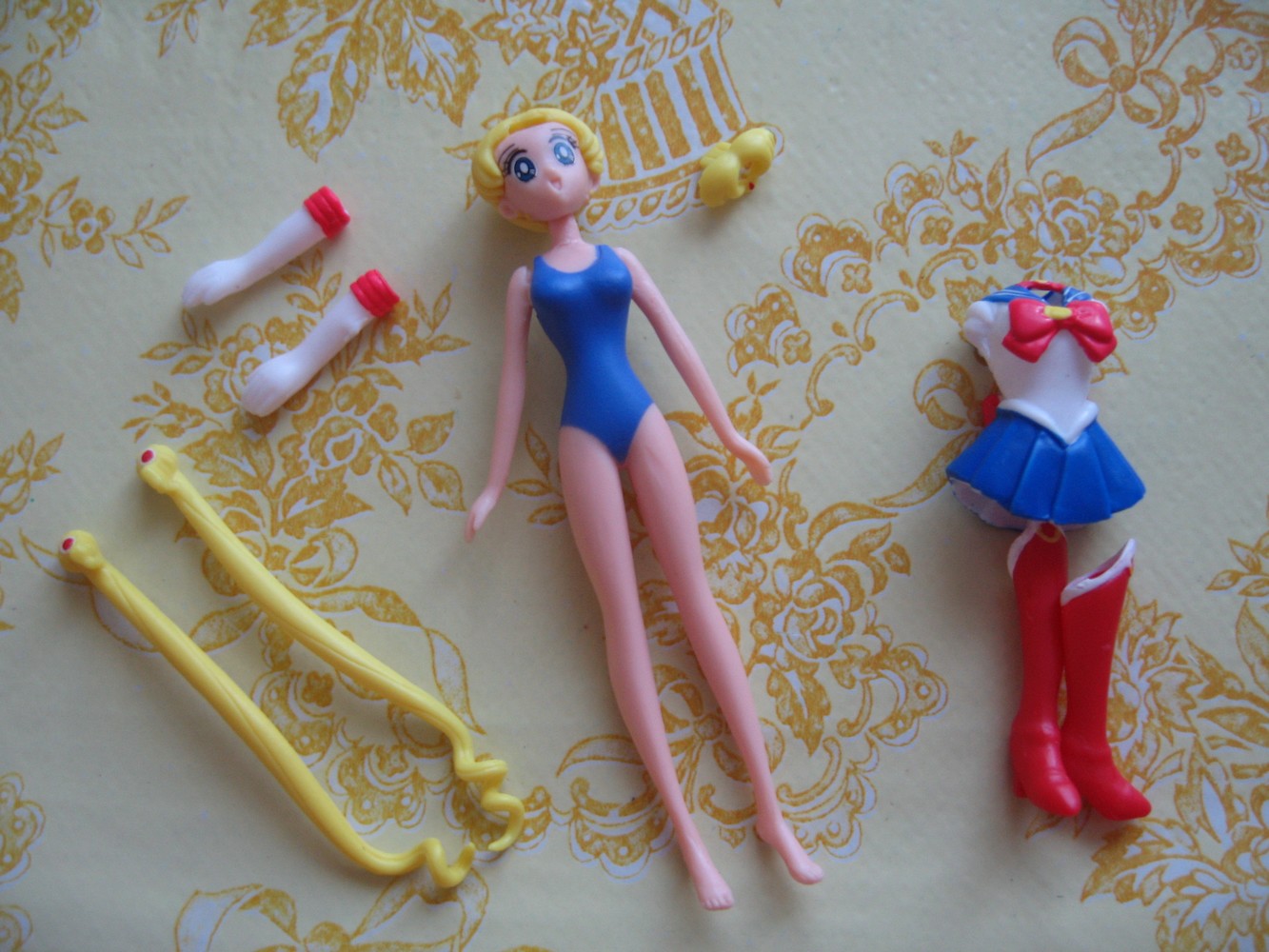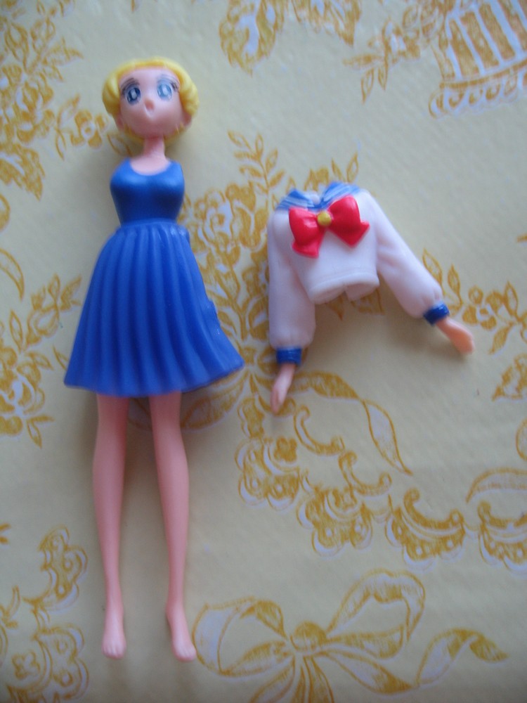 Отдельно стоит сказать про Сейлор Мун. Все дело в том, что к её фигурке прилагался пакетик со сменной одеждой. Проще говоря, Сейлор Мун можно переодевать в Усаги! Но это занятие непростое. У главной героини отстегиваются оданго и челка. Эти части прически сделаны из плотного материала, а вот одежда словно резиновая. Сапоги с Сейлор Мун приходится скатывать буквально как носки, а снимать сейлор-фуку - настоящий кошмар, так и кажется, что она сейчас порвется. Хорошо, что хоть юбка и кофта от школьной формы Усаги сделали раздельными, в отличие от матросского костюма воительницы.