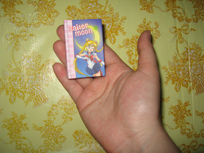 Как я уже сказала, к фигуркам прилагался фан бук. Он поистине микроскопических размеров. Для сравнения ниже идут сопоставления фан бука с ростом фигурки Сейлор Мун, Таксидо Камэна и моей ладонью. Проще говоря, размеры книжек 4см х 6 см, а высота фигурок 8 для Усаги и 9 для Таксидо Камэна соответственно.