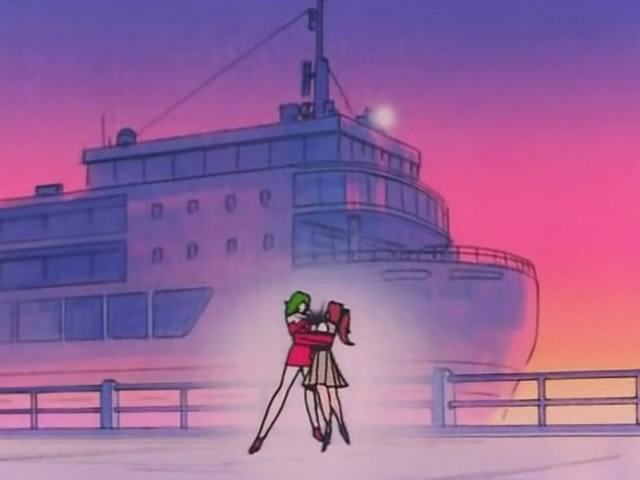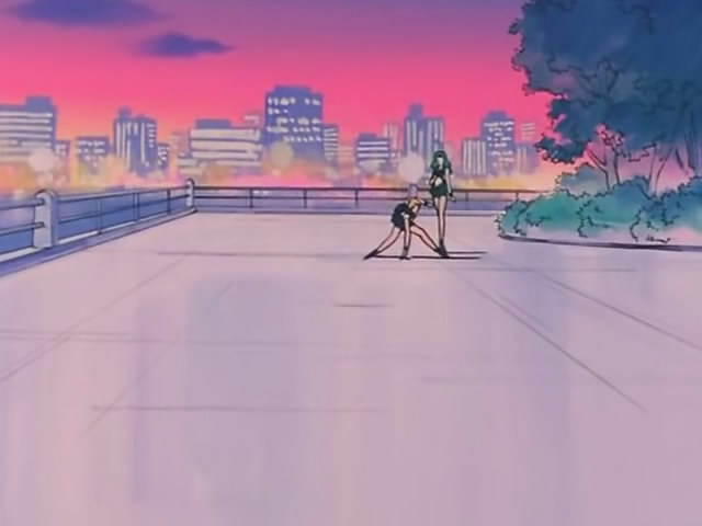 Именно туда завезли Харука и Мичиру Макото, а потом и даймон подоспел. В результате сначала пришлось уничтожить его, а потом еще не навоевавшаяся Сейлор Юпитер решила высказать Уран и Нептун все, что о них думает. Из деталей ландшафта я могу припомнить только ограждение над рекой и большую рекламную вывеску, с которой спрыгивали Сейлор-Воительницы.