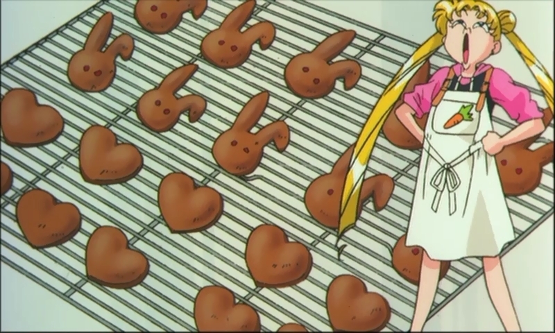 Смена сцены: Токио. В Японии есть обычай, когда девушки на День Валентина дарят испеченное собственноручно печенье или шоколад тому, кто им нравится. Это собираются делать и Сейлоры - к большой злости Усаги Малышка планирует отдать свои печенья Мамору, потому что нет больше никого, кого она любит. (Чиби Усаги очень ясно восхищается Мамору - очевидно, до нее еще не совсем дошло, что он - ее отец, даже не смотря на то, что Усаги она всегда охотно выставляет как свою "ни к чему не способнуюю мамочку"). Усаги чуть не взрывается от ревности, потому что Мамору уделяет Малышке больше внимания, чем ей.