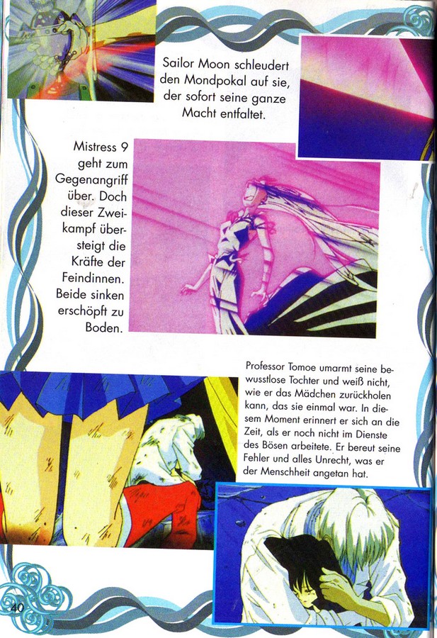 Тот, кто плохо помнит сериал и не очень хорошо видит вблизи, примет все за чистую монету. Но на самом деле, картинки рядом иллюстрируют следующее: Сейлор Мун добровольно отдала Грааль Мистресс 9, та засунула его в специальное устройство, Фараон 90 приближается, все начинает взрываться. Чтобы как-то остановить Фараона, Сейлор Мун атакует его своим жезлом (этот момент создатели книги выдавали за нападение Сейлор Мун на Мистресс), но все безрезультатно. Один из взрывов накрыл Мессию Безмолвия, при этом, её пытались защитить как профессор, так и Сейлор Мун. Причем именно воительница приняла весь удар на себя, а в книге данная иллюстрация (Мистресс 9 в розовом свечении) сопровождается текстом, в котором говорится о том, что данное свечение – атака Сейлор Мун, хотя на самом деле – это взрыв, связанный с приближением Фараона, от которого Сейлор Мун пыталась как раз Мистресс уберечь.