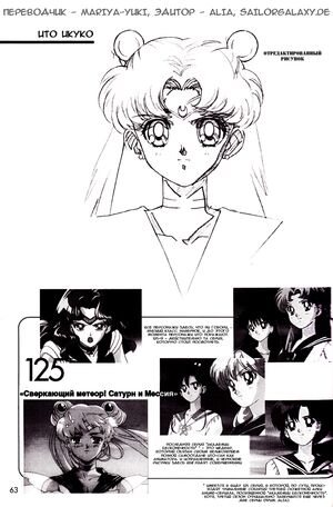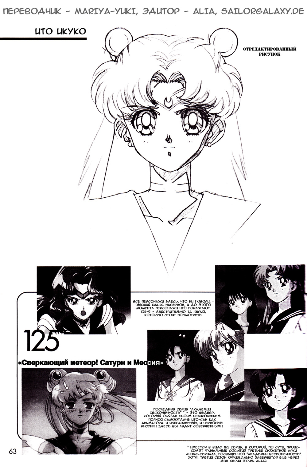 Кроме того, аниматоры часто говорят на каком-то своем языке. Например, описывая события и свой вклад в 125-ую серию, они называют её финальным эпизодом 3-его сезона. На самом деле, мы знаем, что последним эпизодом был 127-ой, но понять, почему аниматоры обозначили так именно 125-ую серию, не составляет труда, ведь именно в ней завершается противостояние Сейлоров с Death Busters, она, фактически, завершает сюжетную канву третьего сезона. А оставшиеся две серии лишь раскладывают по полочкам небольшой оставшийся материал.