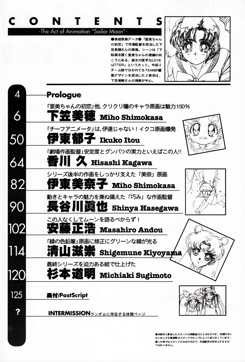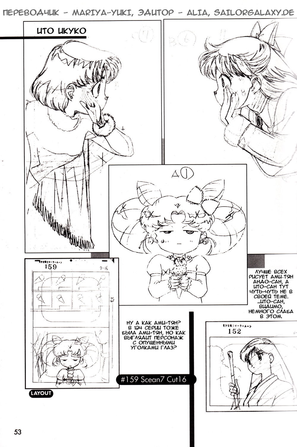 Под конец стоит отметить то, что и о самих аниматорах тоже дается небольшая информация. Указываются все его заслуги, время с которого он начал играть более-менее заметную роль в «Сейлор Мун» и перечисляются особо выдающиеся серии. Вот что говорится об Ито Икуко: «Как главный аниматор – один из выдающихся директоров анимации с середины сериала вместе с Кагава-саном. Ее изображения стали популярны, поэтому говорить много нет смысла, однако несомненно, что ее рисунки оправдывают популярность. Очарование рисунков Ито-сан не обманывает ожиданий. Их особенность – тени розовым флуоресцентным карандашом. На самом деле, впервые Ито-сан появляется в 5 серии «Сейлор Мун». Хотя в это время ее особенности еще не проявляются, и она следует дизайну персонажей Тадано, но то, как ей доверяли, можно понять из того, что она была ответственной за анимацию. Вместе с ответственным за фильм Кагава-саном, она с уверенностью делала ключевые эпизоды каждого сезона».