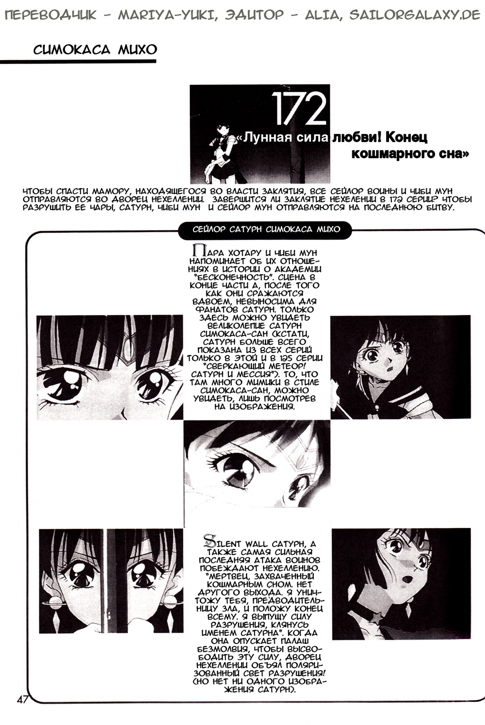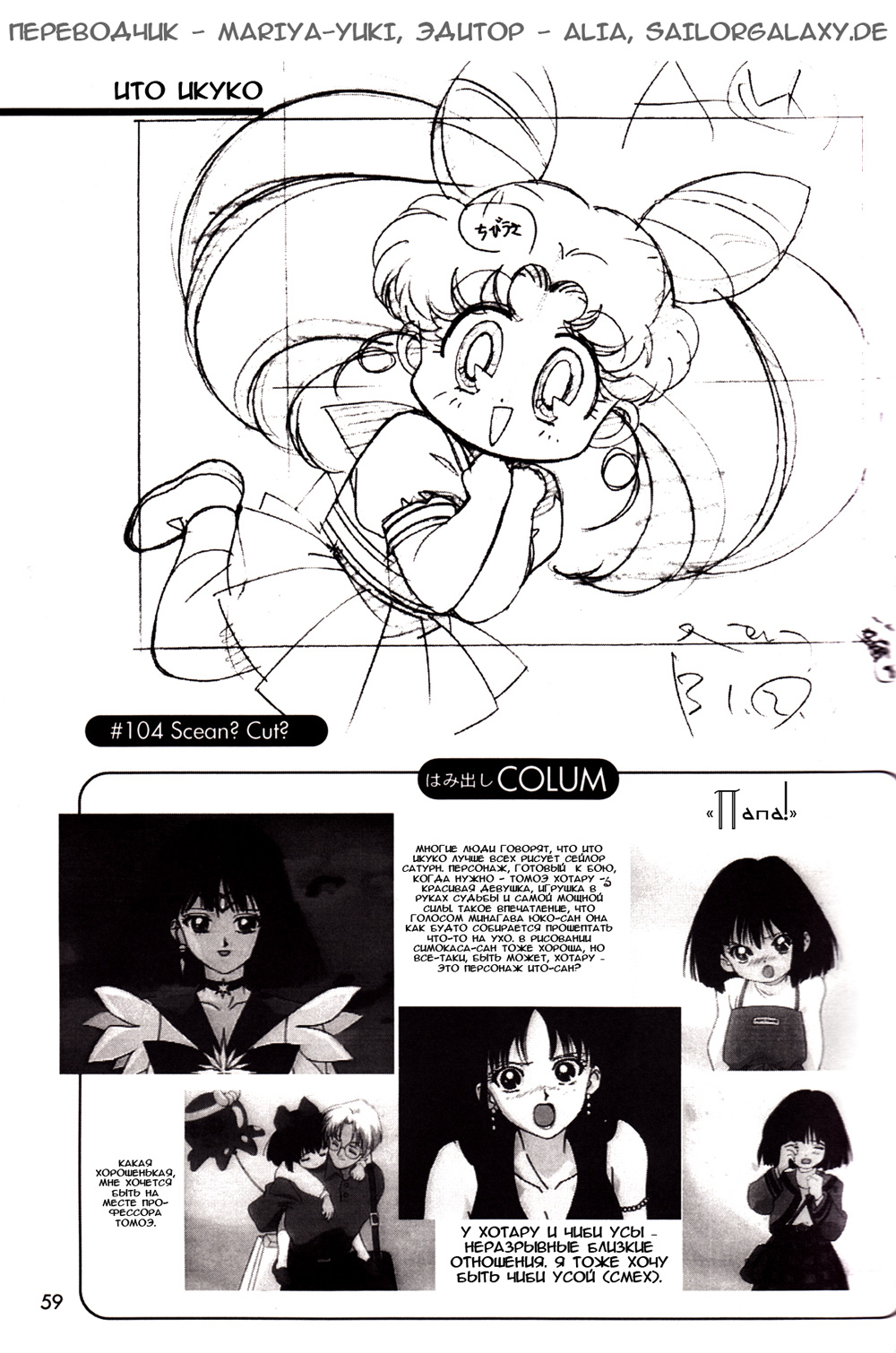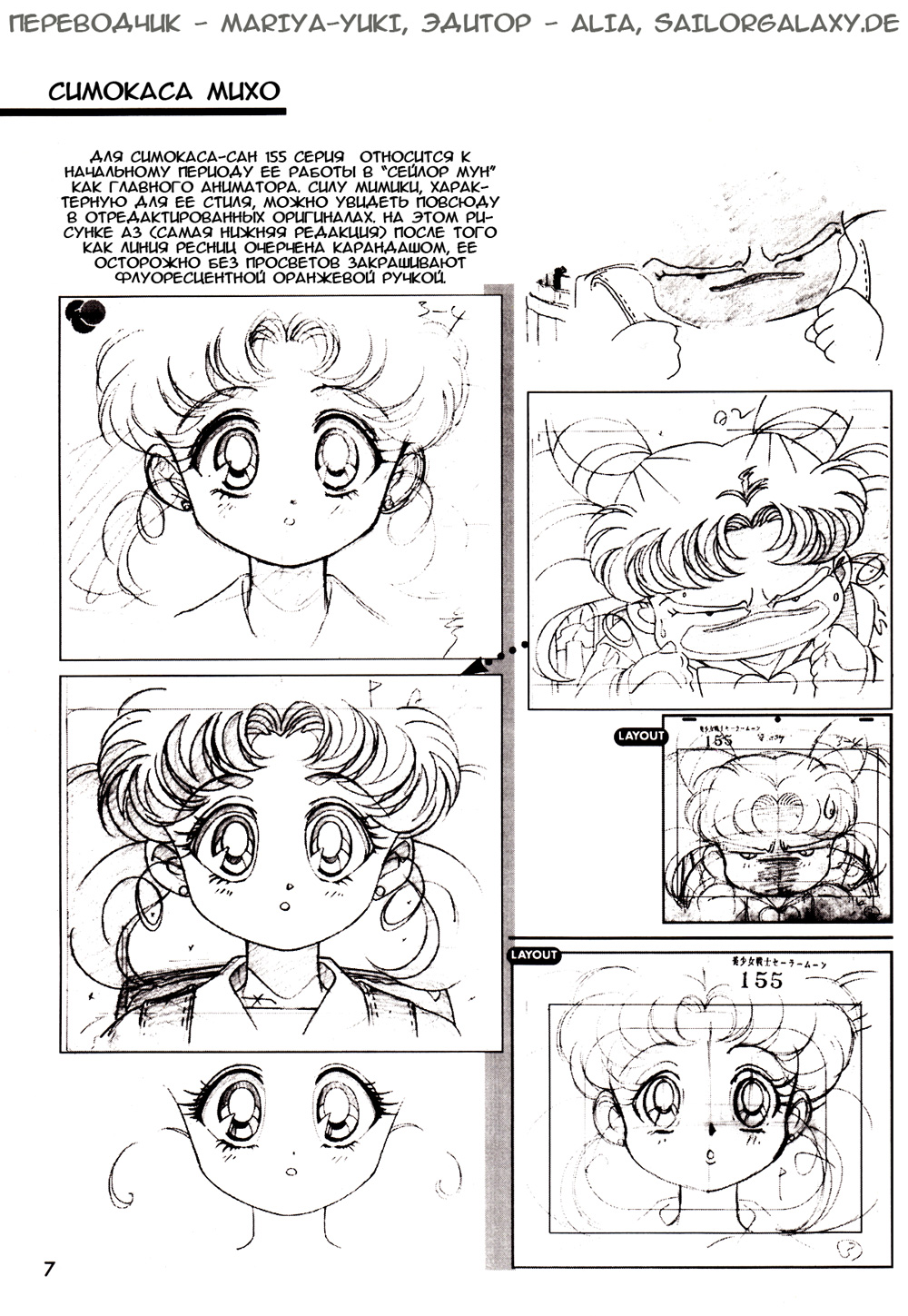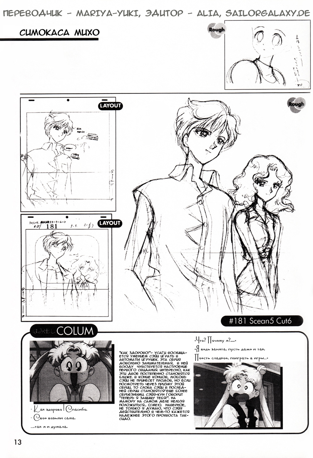 Имена персонажей тоже частенько сокращаются: понимаете, аниматоры для простоты используют в книге тот же самый язык, на котором между собой общаются фанаты «Сейлор Мун». Он, конечно, отличается от того, которым написаны статьи на Sailor Galaxy или того, который использовался при оформлении официальных альбомов по аниме в издательстве Коданся.