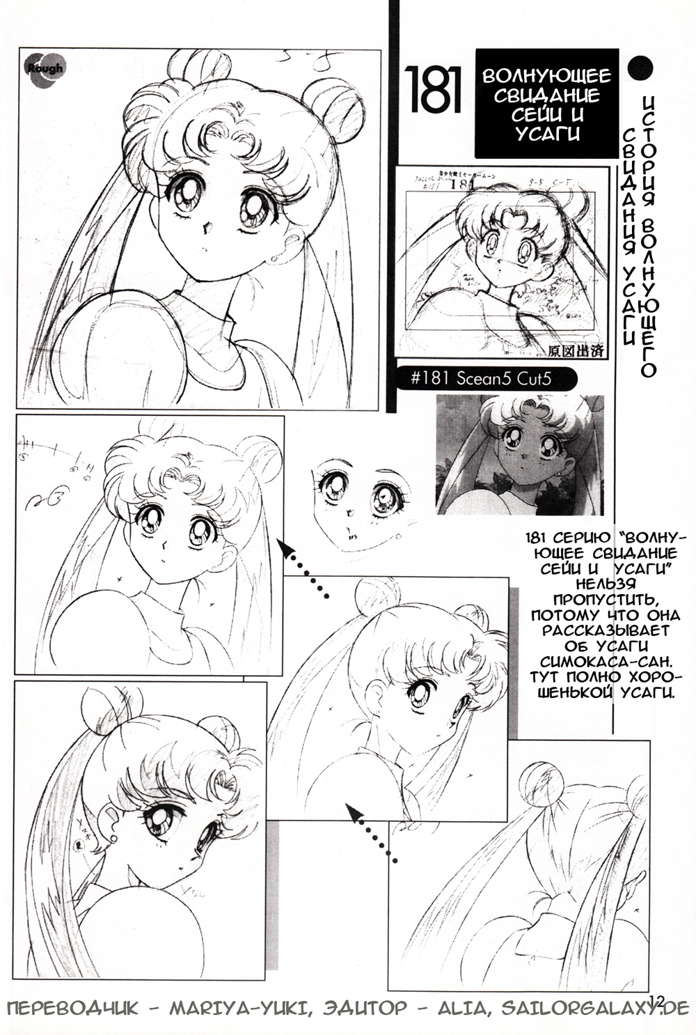 Создатели довольно подробно рассказывают и о том, что является фирменным знаком каждого из них. Например, вот так описывается работа Симокаса Михо над рисунком Принцессы Какюу: «Эта сцена из 193 серии, в которой появляется принцесса Какюу. Есть только зарисовка, которая уже широко использовалась как оригинальный эскиз кадра. Чувствуется мимика, характерная для Симокаса-сан. Особенно характерна детальная прорисовка глаз, которая показывает ее манеру». Кроме того, уточняется, использование какого инструмента является своеобразной фишкой того или иного художника. Например, у Икуко Ито это розовый флуоресцентный карандаш. После прочтения такой информации становится жалко, что книга черно-белая :(