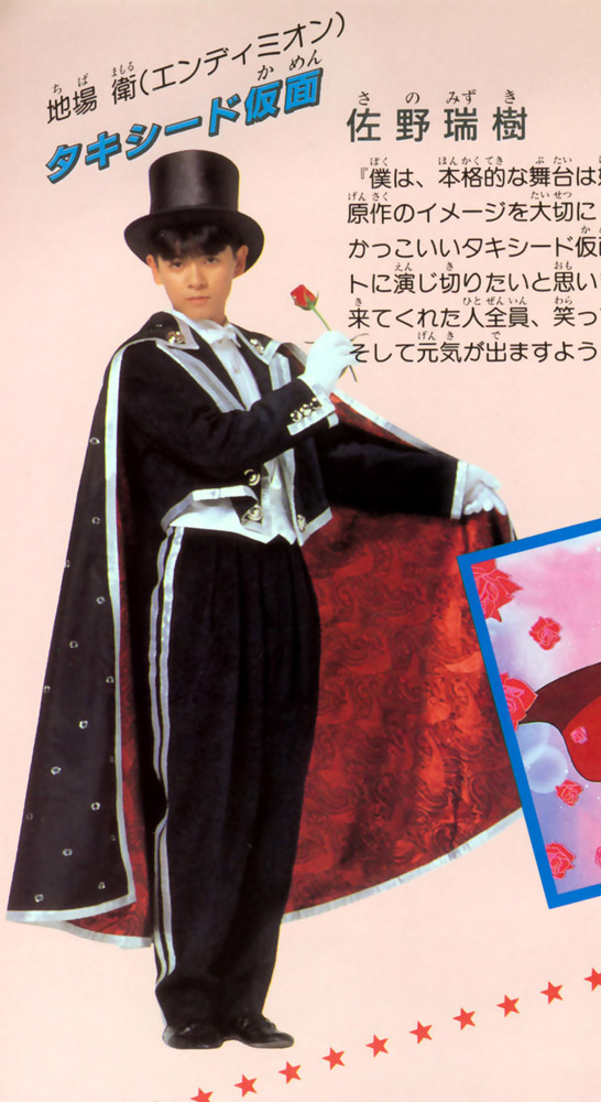 Хотя это незначительно, но все-таки является особенностью: сценические костюмы Сано Мидзуки немного отличались от костюмов всех его последователей. В роли Мамору он вместо зеленого пиджака носил серый (как в манге), а в роли Таксидо Камэнра его плащ был черным, в то время как у всех последующих актеров - золотой.