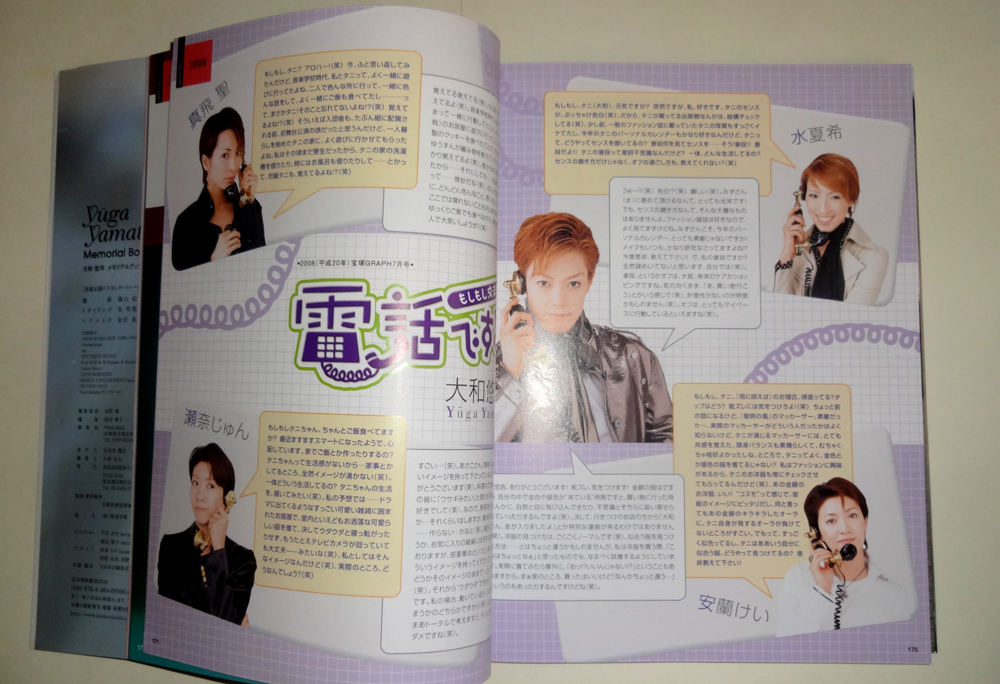Когда Ямато Юга покидала Такарадзуку, театр для ее поклонников выпустил огромную памятную книгу, настоящую Библию своего рода. Там собран обширнейший материал об этой актрисе. И обзор каждой роли, и мысли Ямато Юги о ней, обзор коллег по цеху, хобби и пристрастий Ямато Юги, множество фотографий и разного рода интервью. Обо всем и не упомянуть. Книга называется Yamato Yuuga Memorial Book.
