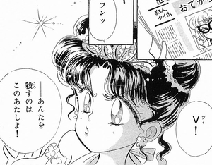 Она собирала энергию всех людей, которые поют караоке. Полная энтузиазма она была уверена, что ее плану сужден успех. Она расставила специальные высасывающие энергию микрофоны в нескольких караоке-центрах. Но Артемис недавно вручил Минако новый предмет... волшебный микрофон.