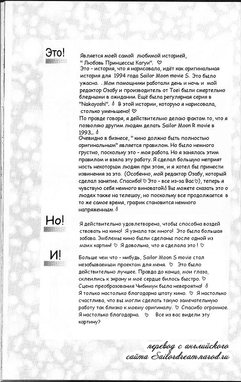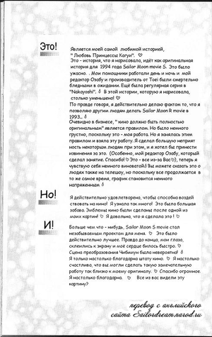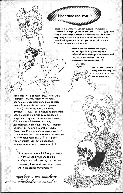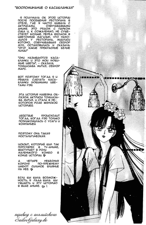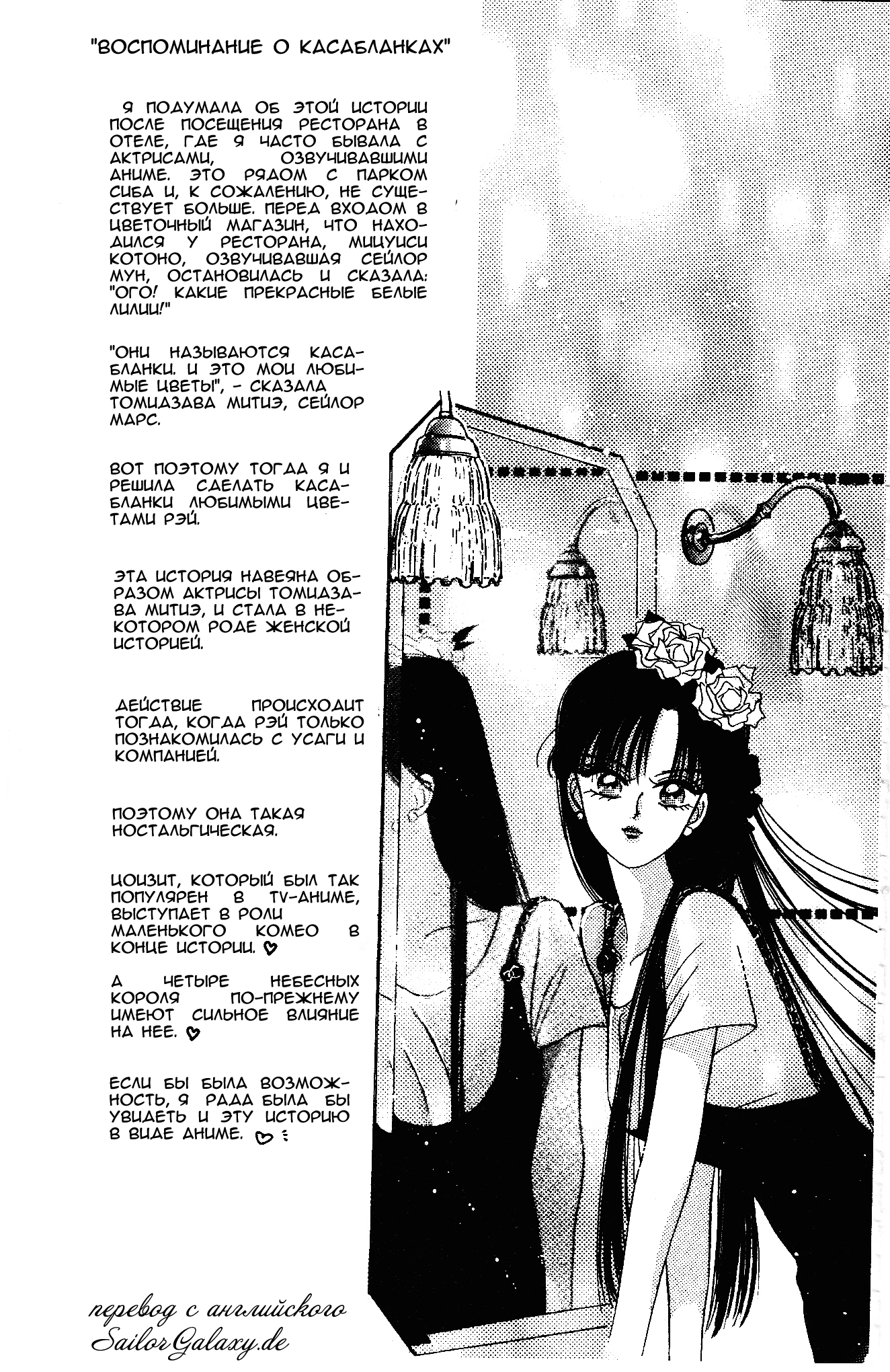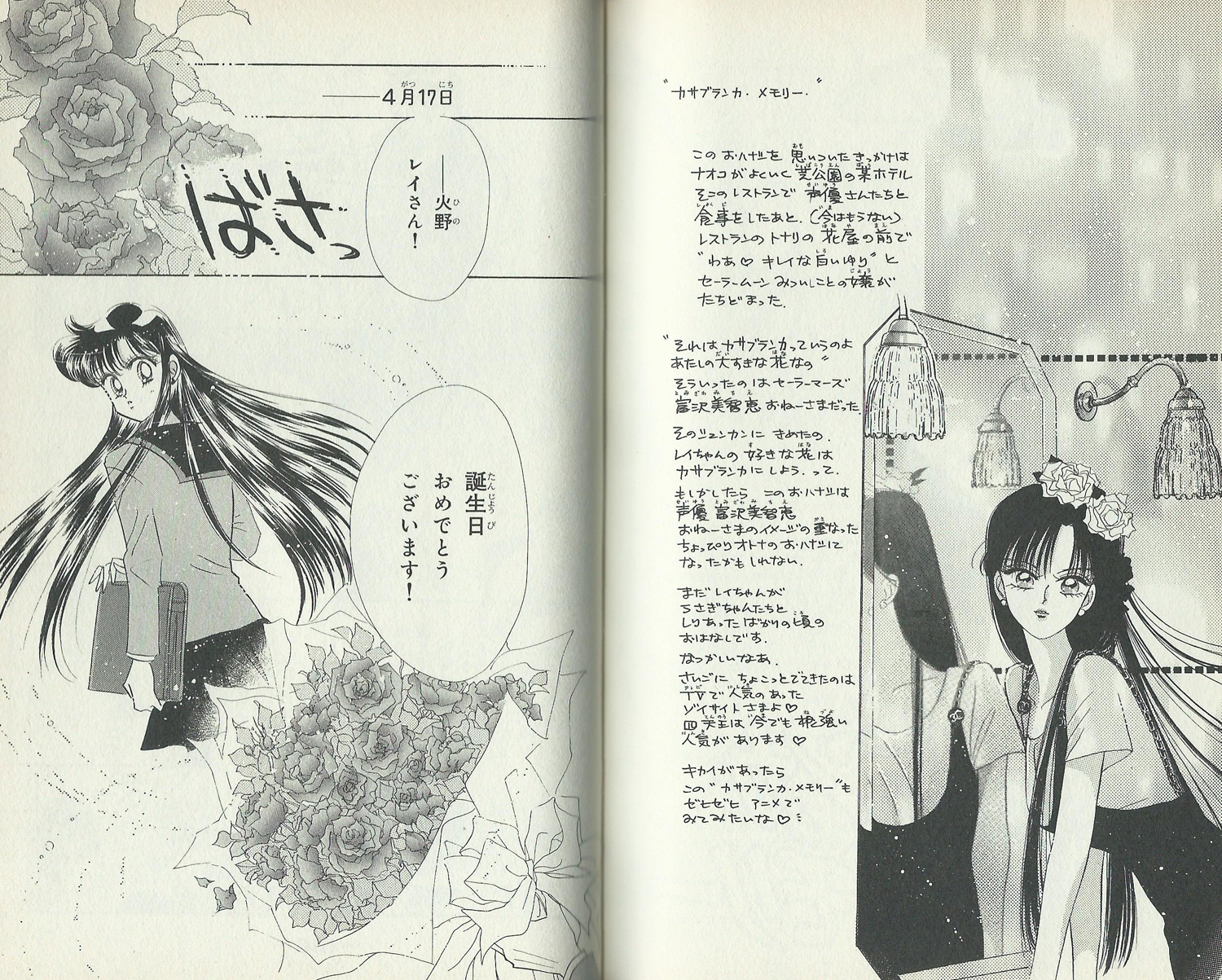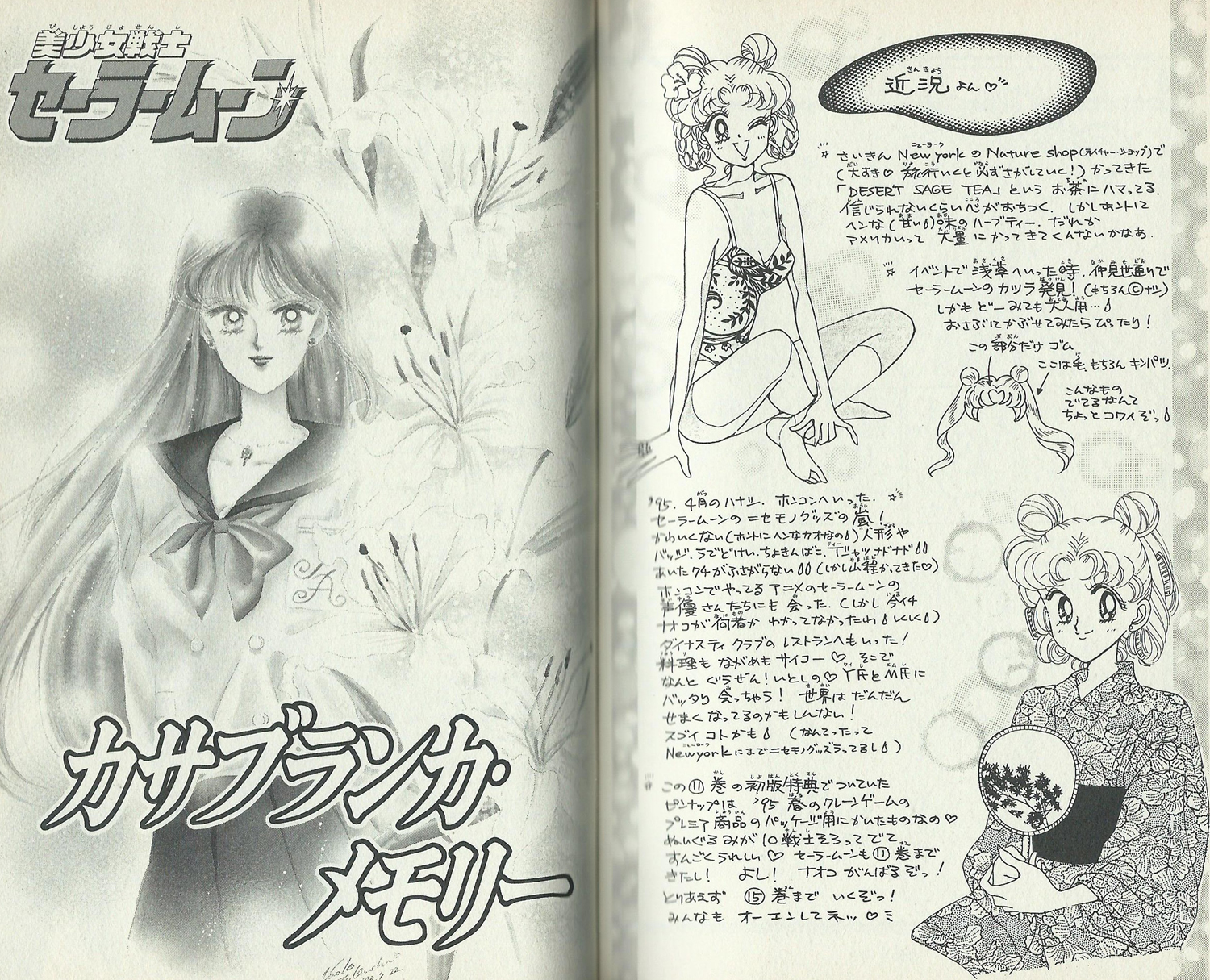 Дальше мы переносимся в середину книги. После завершающей страницы «Кагуи» идут многочисленные рассказы Такэути Наоко о том, как она создавала эту историю, как на нее (Наоко) повлияло производство полнометражного фильма, как она посетила Америку и наблюдала запуск шаттла… В общем, очень много интересной информации вкупе с зарисовками к манге. А после – манга о непростой любовной истории Рэй-тян «Воспоминание о Касабланках» в конце которой снова интересные дополнения от Наоко. На последних страницах тома обзор изданных томов манги «Сейлор Мун» и «Сейлор Ви», первых двух артбуков и прочих работ Такэути Наоко.