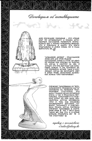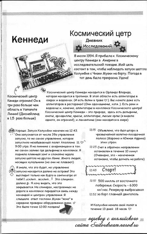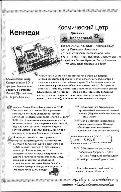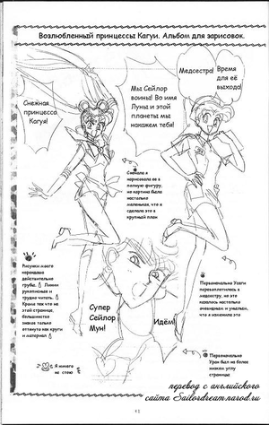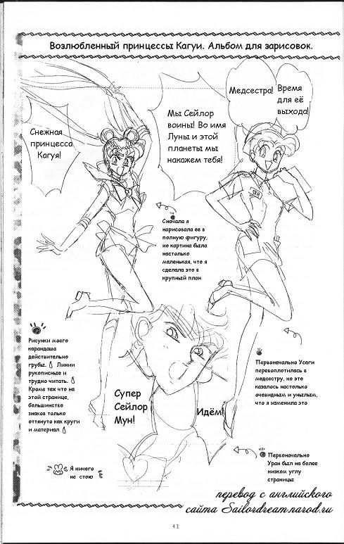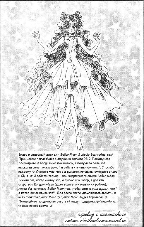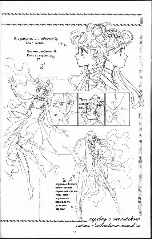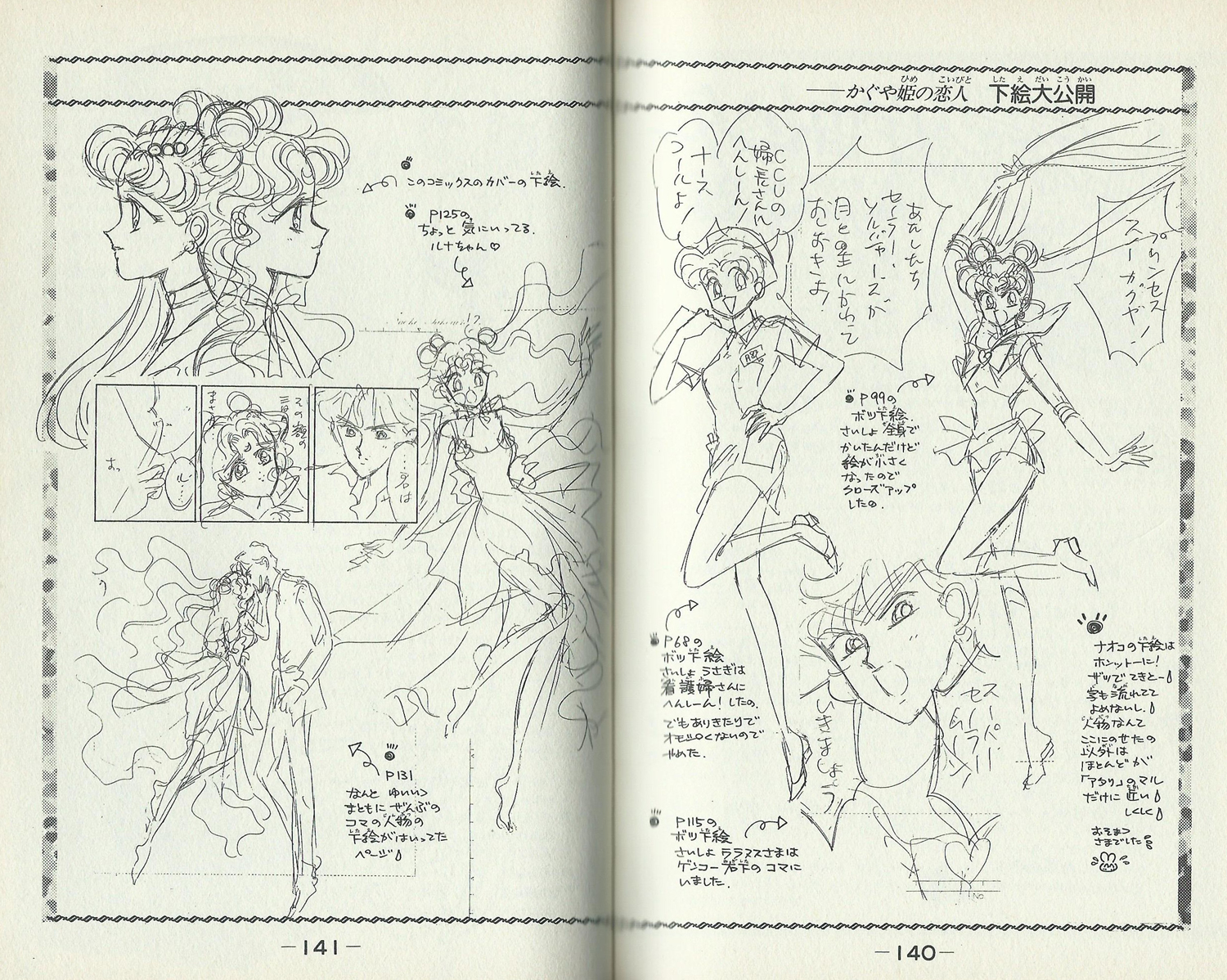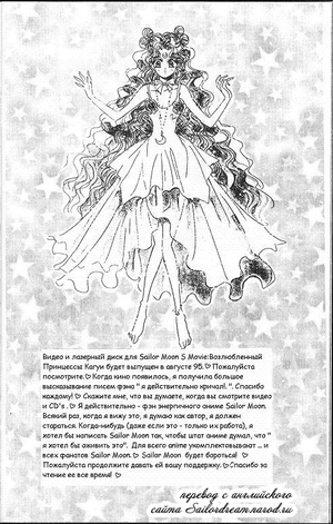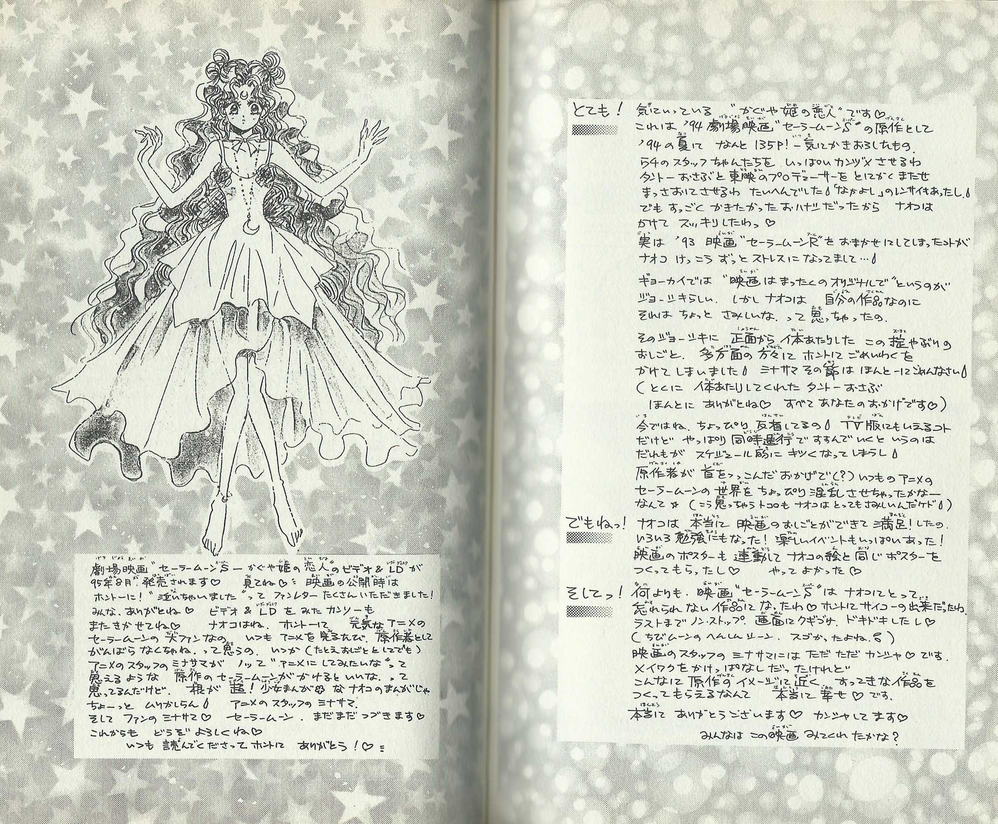 Дальше мы переносимся в середину книги. После завершающей страницы «Кагуи» идут многочисленные рассказы Такэути Наоко о том, как она создавала эту историю, как на нее (Наоко) повлияло производство полнометражного фильма, как она посетила Америку и наблюдала запуск шаттла… В общем, очень много интересной информации вкупе с зарисовками к манге. А после – манга о непростой любовной истории Рэй-тян «Воспоминание о Касабланках» в конце которой снова интересные дополнения от Наоко. На последних страницах тома обзор изданных томов манги «Сейлор Мун» и «Сейлор Ви», первых двух артбуков и прочих работ Такэути Наоко.
