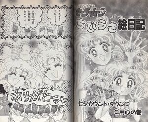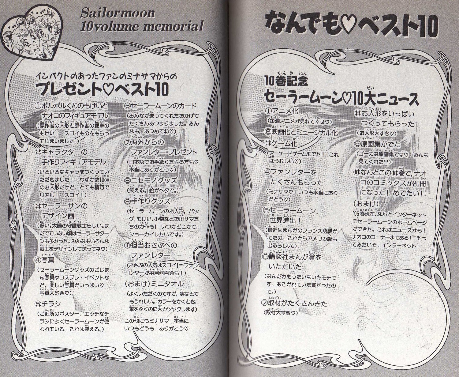 Как уже говорилось выше, со 140-ой страницы начинается дневник Чиби Усы. На этот раз она записала туда, как прошел её день рожденья. Со 162-ой страницы начинается так называемый «Sailor Moon 10 volume Memorial» 166-167 страницы украшены иллюстрациями других авторов на тему Сейлор Мун. 168-169 страницы – это анкеты 10-ти воительниц. Следующие три разворота посвящены работам Наоко. Среди них есть не только тома «Сейлор Мун» и другой манги этого автора, но даже и артбуки.