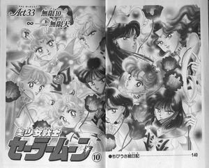 Смотрим дальше. На первой странице комикса изображена Серенити, стоящая на коринфской колонне. По странице идут надписи – слова Серенити о свете, что озарил Землю. Внизу снова логотип «Прекрасная воительница Сейлор Мун» и номер тома. Перелистываем страницу снова и на развороте видим оглавление. Оно показывает, что со страницы 140 будет начинаться иллюстрированный дневник Чиби Усы. В верхнем же левом углу надпись: акт 33 – Бесонечность 10 – Бесконечность. Фоном для оглавления послужила все так же картинка, из которой сделали постер для тома. На следующем развороте мы видим список персонажей, а со страницы 6 начинается 33 акт. Заканчивается он на 136-ой странице. На 137-ой странице нас ждет изображение Харуки, Мичиру, Сэцуны и Хотару в повседневной одежде. 138-139 страницы посвящены третьему рейтингу персонажей, с которым вы можете ознакомиться вот здесь.