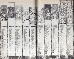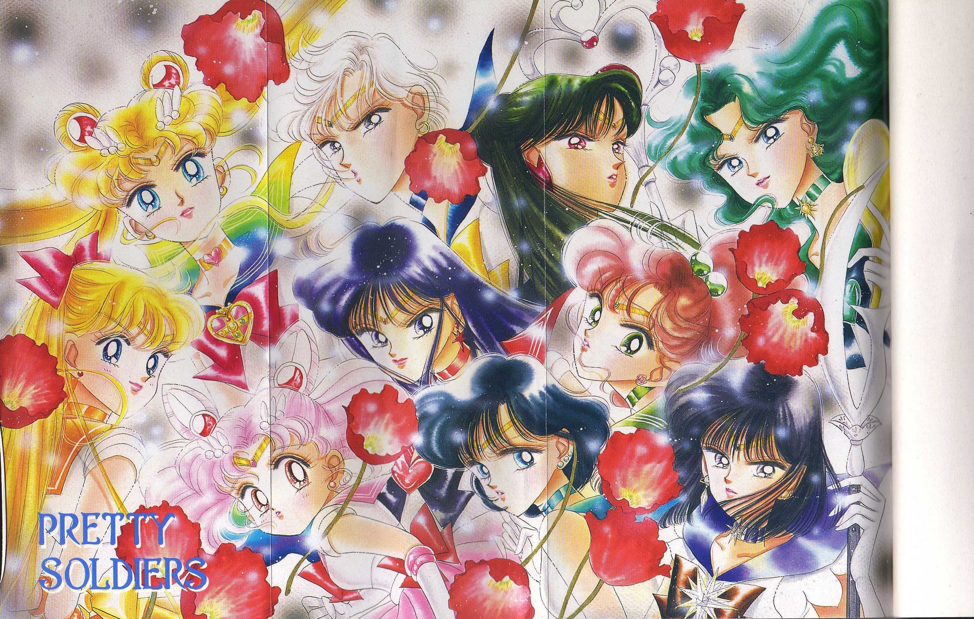 Открыв книгу, перед первой страницей мы замечаем вклеенный постер с десятью воительницами, сложенный втрое. Воительницы изображены на фоне красных цветов, которые больше всего походят на тюльпаны. Внизу надпись: Pretty Soldiers (прекрасные воительницы). Стоит отметить, что постер напечатан очень качественно и краски очень сочные (как жаль, что мой принтер этого не передает!)