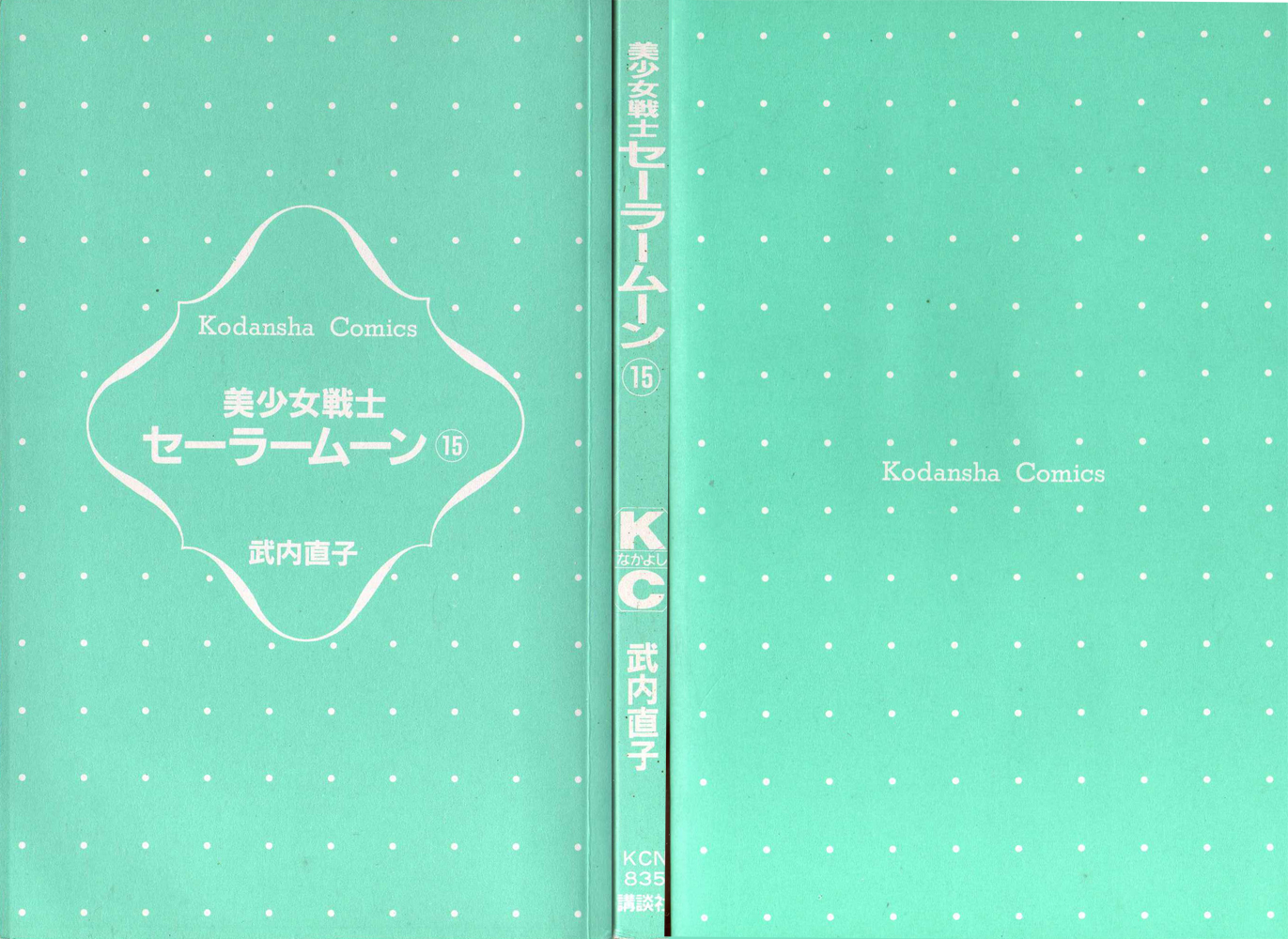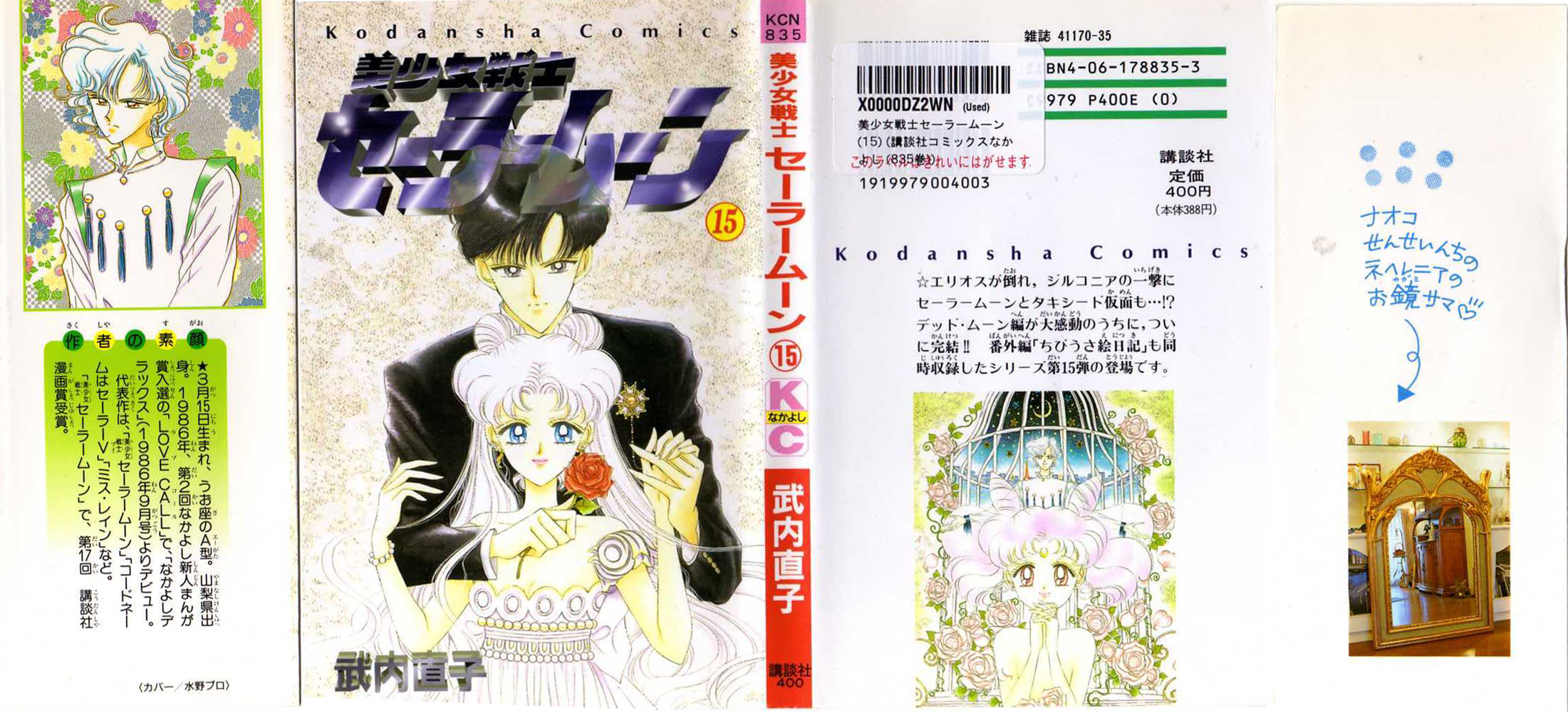 Обратная сторона съемной обложки досталась Принцессе Леди Серенити и Гелиосу. Наоко как-то рассказывала, что долго думала, какую картинку использовать для передней обложки. К своему сожалению, она давно решила, что титульная обложка на этот раз будет белой, поэтому ей пришлось использовать в качестве таковой картинку с Эндимионом и Серенити, а эту с Гелиосом и Юной Леди отправить на заднюю обложку. Над картинкой есть традиционная надпись, характерная для каждого тома. Она кратко рассказывает о том, что должно произойти в этом выпуске. На этот раз надпись была такая: «Гелиос погибает, первый удар Цирконии направлен на Сейлор Мун и Таксидо Камэна?! Мертвая Луна пока создает большое впечатление, наконец-то финал!! Дополнительный выпуск (иллюстрированный дневник Чиби Усы) также помещен в серию вышедшего 15-ого выпуска».