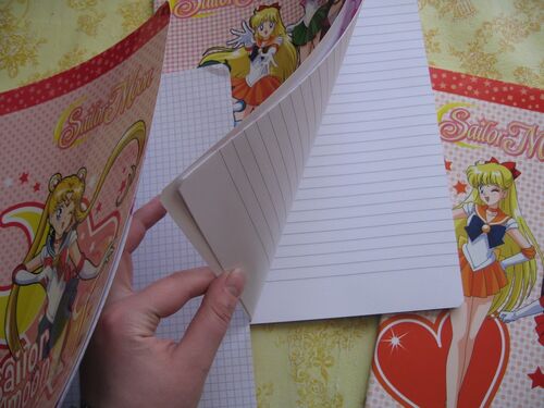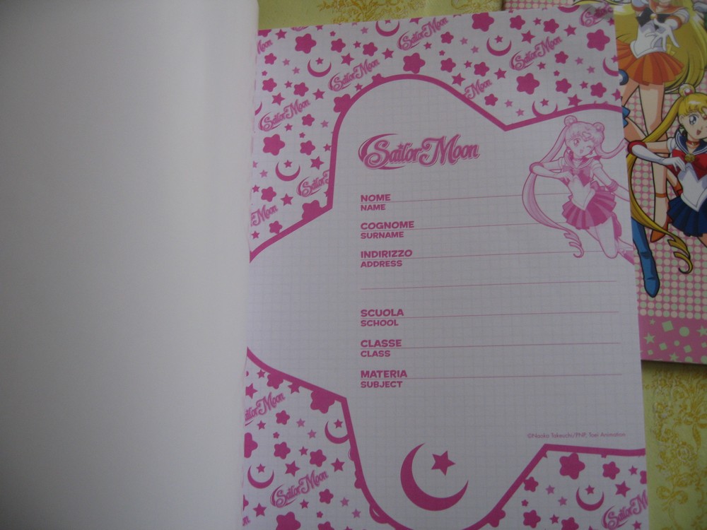 Тетради по «Сейлор Мун» были выпущены Auguri Preziosi в 2011 году. Насколько известно, эта компания входит в группу компаний Giochi Preziosi. Отпечатаны они также были в Италии, в отличие от тех же итальянских наклеек, например, которые штамповали в Китае. Для оформления тетрадок были использованы изображения Марко Албьеро. В плане оформления существует четыре вида: тетрадь с Сейлор Мун, тетрадь со всеми пятью воительницами сразу, с Марс и Венерой, с Меркурий и Юпитер.