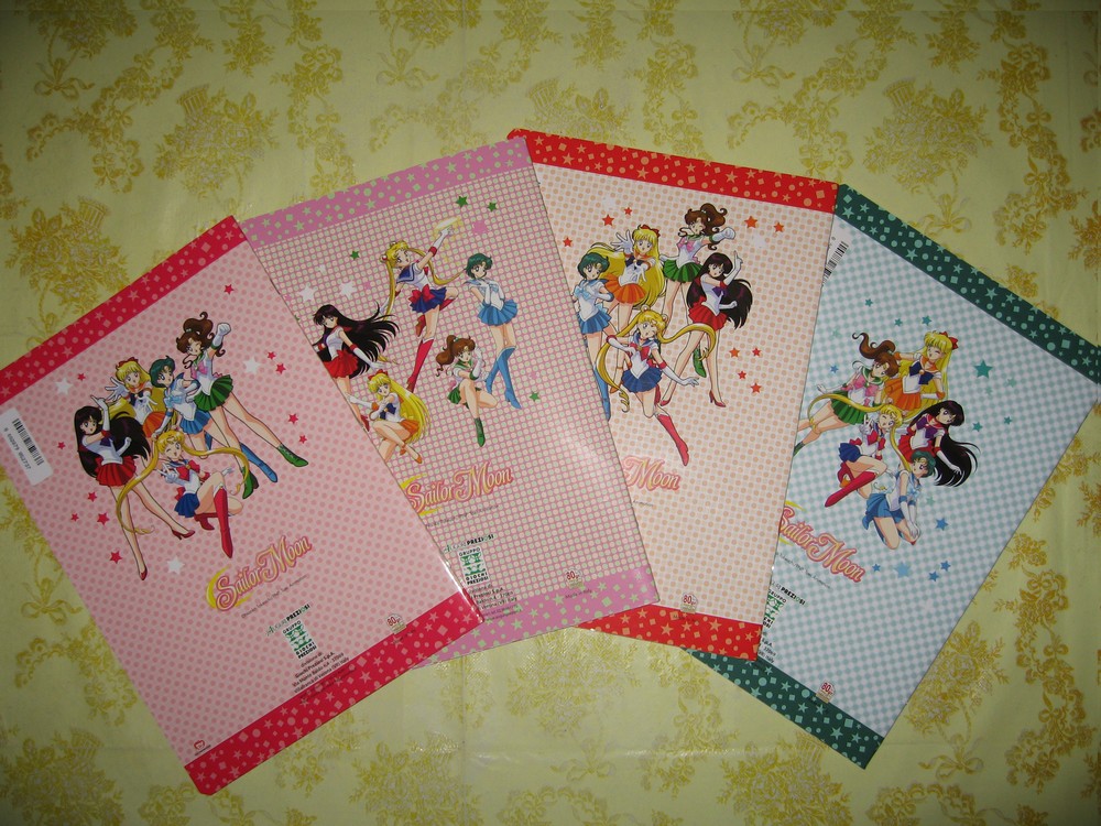 Сзади у тетрадей тоже присутствует изображение пяти воительниц, причем на всех четырех эти картинки разные. Хотя, стоит отметить, что на оборотной стороне тетради Марс/Венера изображена та же картинка, что находится на лицевой стороне тетрадки с пятью воительницами. А на оборотной стороне тетради с Сейлор Мун подружки Усаги изображены в тех же позах, что и на той тетрадке, о которой говорилось выше, но группировка у них другая, да и изображение Сейлор Мун отличается.