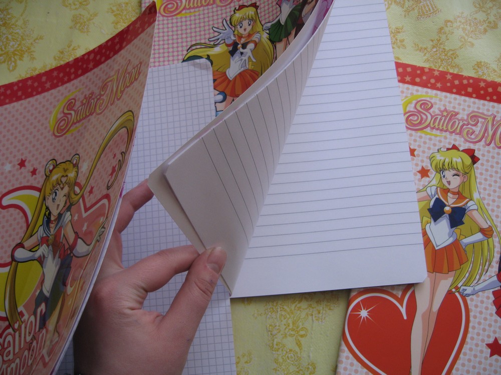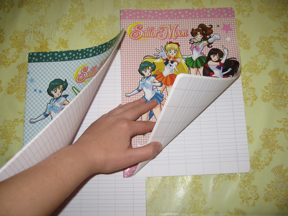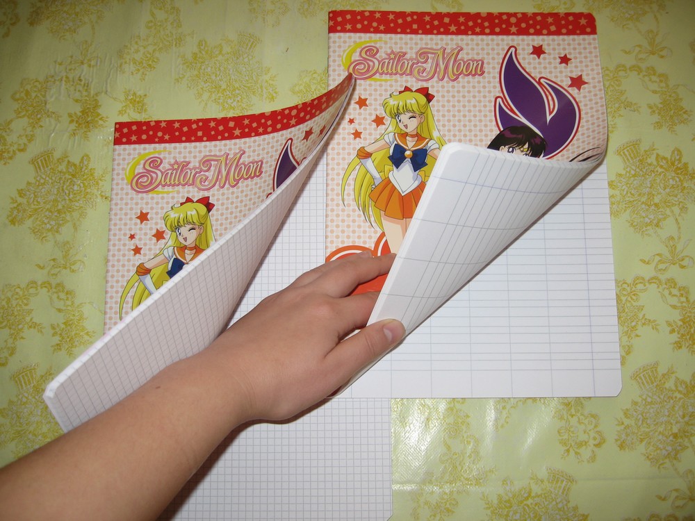 Дополнительные первая и последняя страницы тетрадей содержат логотипы «Сейлор Мун», изображения звезд и полумесяцев с наружной стороны. С внутренней такие страницы белые, поэтому, если вам не хватило для записей сорока имеющихся, можете залезть на дополнительную страничку. Первая страница каждой тетради оформлена абсолютно одинаково. Помимо логотипов и звездно-лунных картинок, она содержит блок для заполнения: имя, фамилия, адрес, школа, класс, предмет. На такой странице есть изображение Сейлор Мун. Стоит также добавить, что тетради по «Сейлор Мун» не имеют полей. По крайней мере, те, что есть у меня.