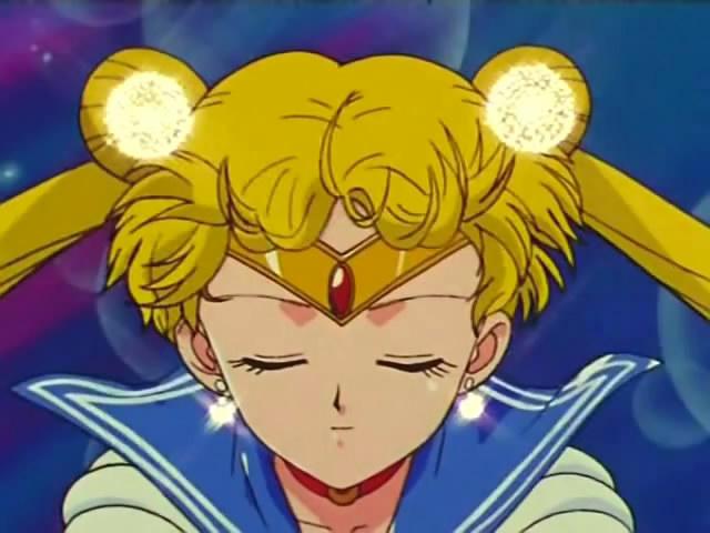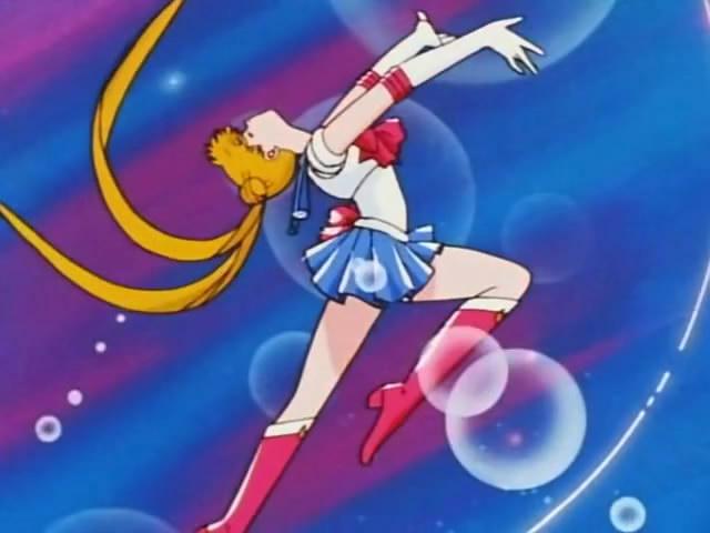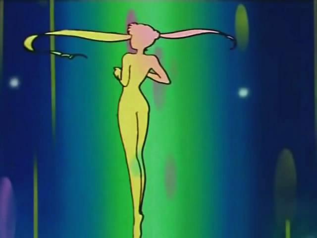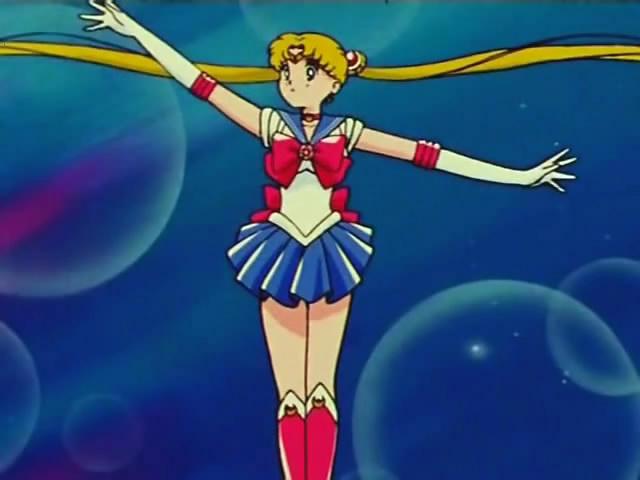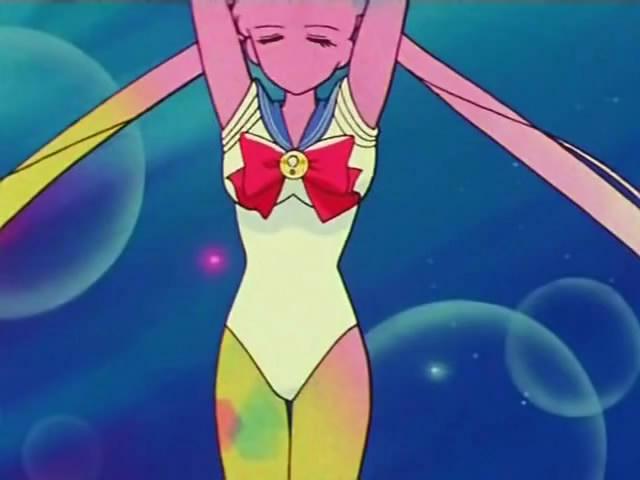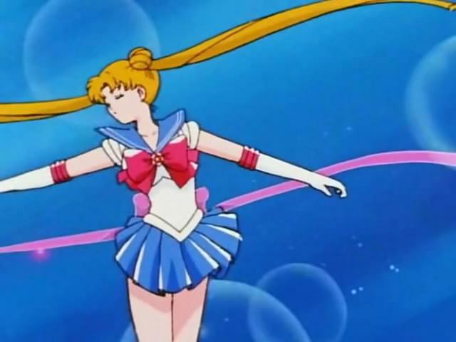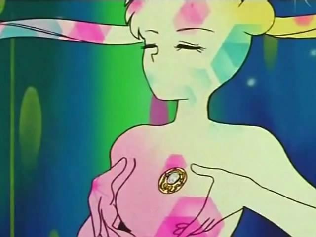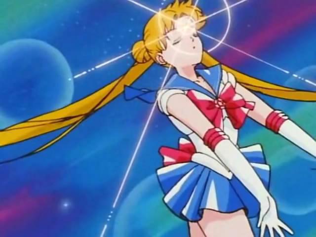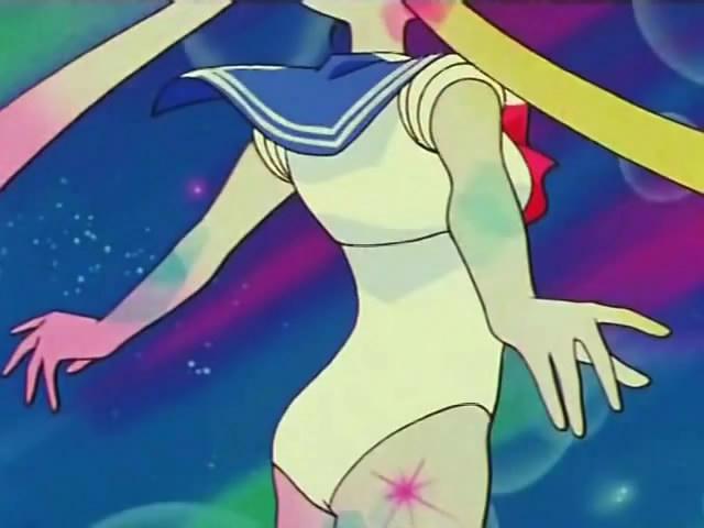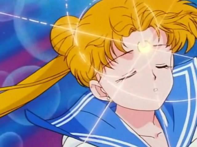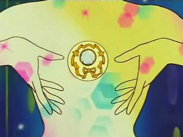 В аниме Усаги выкрикивает слова заклинания и поднимает вверх руку с Кристальной звездой. Крышка броши открывается, показывая Серебряный кристалл. Усаги взмахивает ладонью второй руки, высвобождая кристальную энергию Серебряного кристалла. Брошь испускает яркий розовый свет. Тело охватывает желто-розовое сияние, показывают лишь его сверкающий силуэт. Усаги поднимает руки высоко над головой, между ладонями у нее парит сверкающая брошь. Усаги опускает руки и держа ладони с парящей между ними брошью на уровне груди, совершает несколько круговых пируэтов на ярком сине-зеленом фоне. Яркое сияние – брошь прикрепляется к груди. На мгновение появляется искрящийся силуэт белых крыльев. Тело обволакивают прозрачные розовые ленты, намечаются, а затем формируются трико, бант и воротник. Крылья исчезают. Плавный взмах руками, яркое сияние, появляются розовые ленты, превращаясь в перчатки с налокотниками. Такие же ленты образуются и на ногах, превращаясь в сапоги. Сияние, и появляется синяя юбка с длинными красными лентами. Спустя мгновение ленты преобразуются в бант на спине. Усаги вскидывает обе руки, словно хочет обнять целый свет. Лоб освещает яркое сияние, появляются драгоценная диадема, сережки и украшения на оданго. Взмах руками, и Сейлор Мун встает в боевую позицию на фоне яркого полумесяца, украшенного орнаментом.