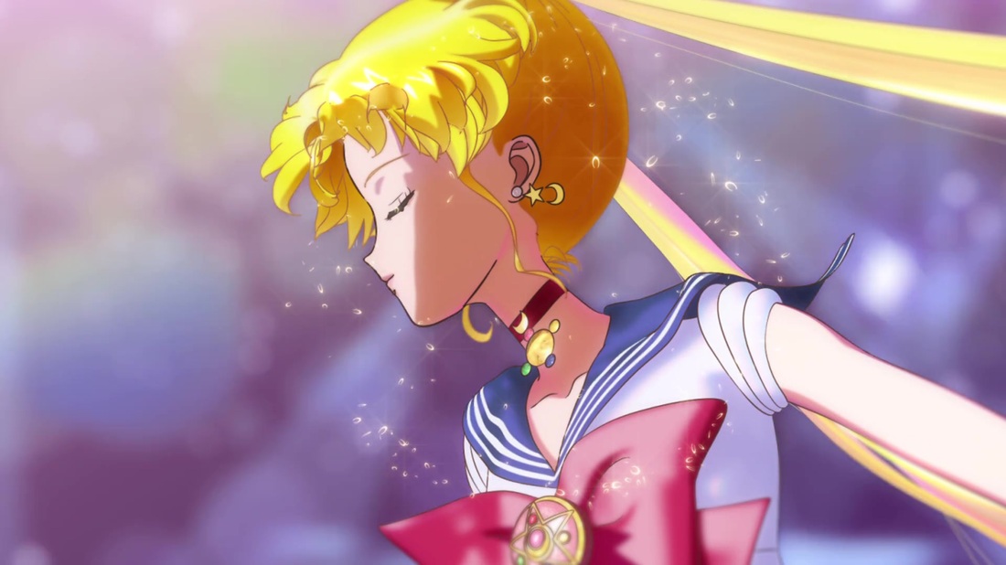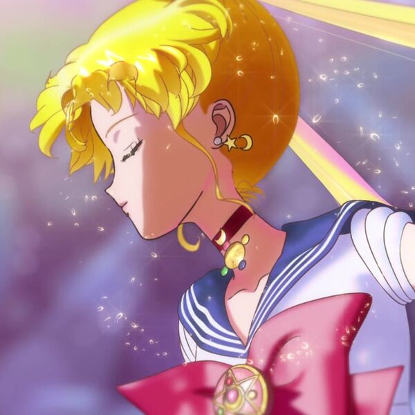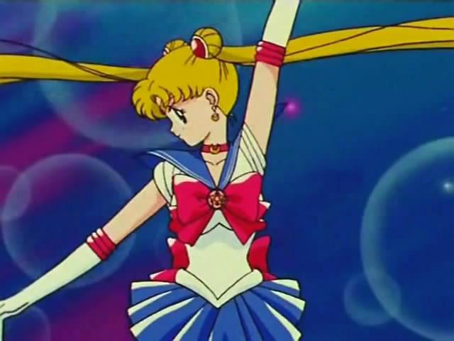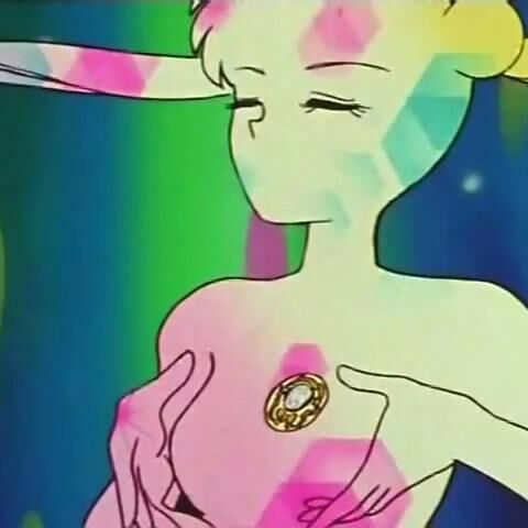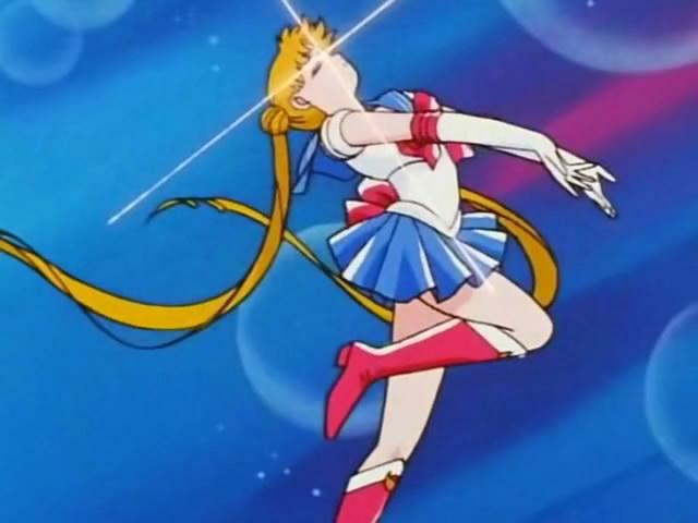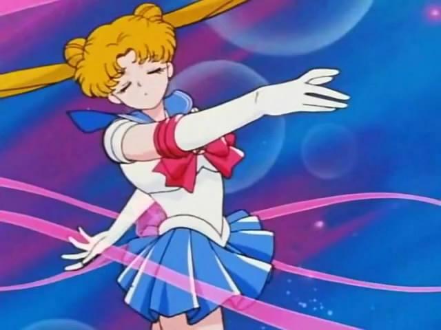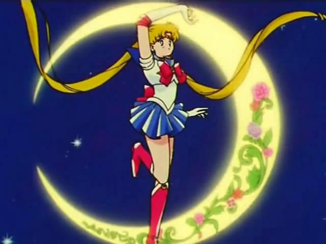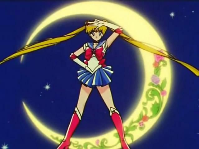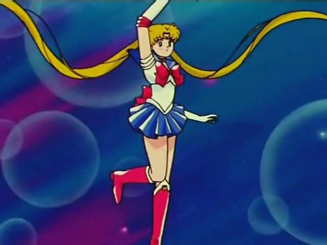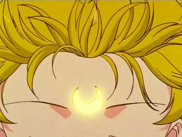 В аниме Усаги выкрикивает слова заклинания и поднимает вверх руку с Кристальной звездой. Крышка броши открывается, показывая Серебряный кристалл. Усаги взмахивает ладонью второй руки, высвобождая кристальную энергию Серебряного кристалла. Брошь испускает яркий розовый свет. Тело охватывает желто-розовое сияние, показывают лишь его сверкающий силуэт. Усаги поднимает руки высоко над головой, между ладонями у нее парит сверкающая брошь. Усаги опускает руки и держа ладони с парящей между ними брошью на уровне груди, совершает несколько круговых пируэтов на ярком сине-зеленом фоне. Яркое сияние – брошь прикрепляется к груди. На мгновение появляется искрящийся силуэт белых крыльев. Тело обволакивают прозрачные розовые ленты, намечаются, а затем формируются трико, бант и воротник. Крылья исчезают. Плавный взмах руками, яркое сияние, появляются розовые ленты, превращаясь в перчатки с налокотниками. Такие же ленты образуются и на ногах, превращаясь в сапоги. Сияние, и появляется синяя юбка с длинными красными лентами. Спустя мгновение ленты преобразуются в бант на спине. Усаги вскидывает обе руки, словно хочет обнять целый свет. Лоб освещает яркое сияние, появляются драгоценная диадема, сережки и украшения на оданго. Взмах руками, и Сейлор Мун встает в боевую позицию на фоне яркого полумесяца, украшенного орнаментом.