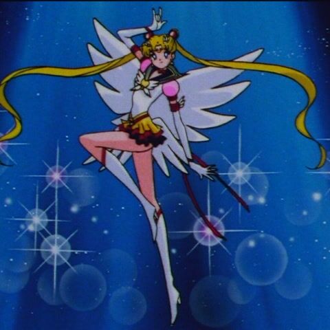 Появляется брошь Eternal Moon Article. Крышка броши открывается, показывая нам Серебряный кристалл. Усаги взмахивает рукой, как бы высвобождая его энергию. Из Серебряного кристалла вырывается ослепительная энергия розового цвета, заволакивая все вокруг. Розоватое пространство заволакивает вихрь из множества кружащихся мягких пушистых перьев. Появляются вспышки золотистого света, которые как бы сливаются воедино, формируя ослепительно золотой полумесяц на лбу воительницы. Закрыв глаза, она расправляет свои новообразованные прекрасные белоснежные крылья, напоминающие лебединые, и выпускает в воздух целые потоки перышек. Сверкнув розовым светом, брошь прикрепляется к груди воительницы. Появляются белое трико с полосатым синим воротником и круглыми рукавами. Девушка раскидывает руки в стороны. Перышки окутывают левую руку, формируя белые перчатки с красной ленточкой. То же самое происходит и с правой рукой. Со сверкающим золотым полумесяцем на лбу воительница кружится на переливающемся ярко-синем фоне. Новый вихрь из крутящихся белоснежных перьев на мгновение заволакивает ее фигуру. Когда перья рассеиваются, мы видим воительницу в уже готовом костюме Вечной Сейлор Мун – появляются брошки на оданго, белые заколки и сапоги. Еще один круг, – и крылья Вечной Сейлор Мун укорачиваются, принимая свою привычную форму. Перевоплощение закончено. Встав на одной ноге и высоко приподняв вторую, воительница Луны встает боевую позу на фоне сверкающих звездочек.