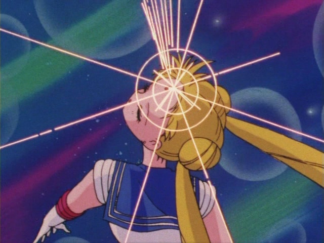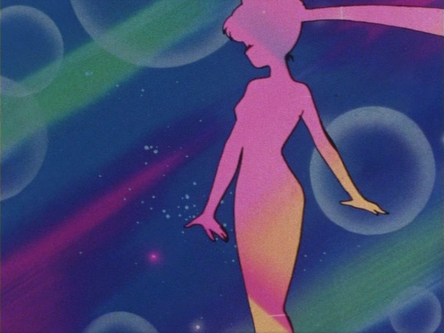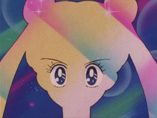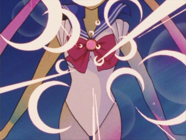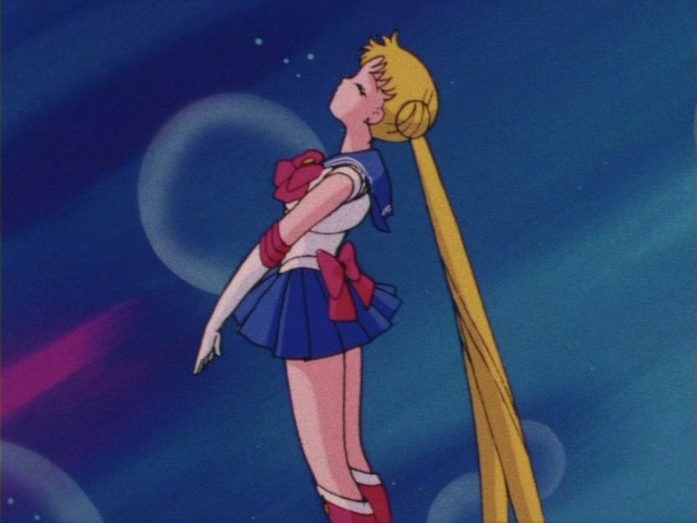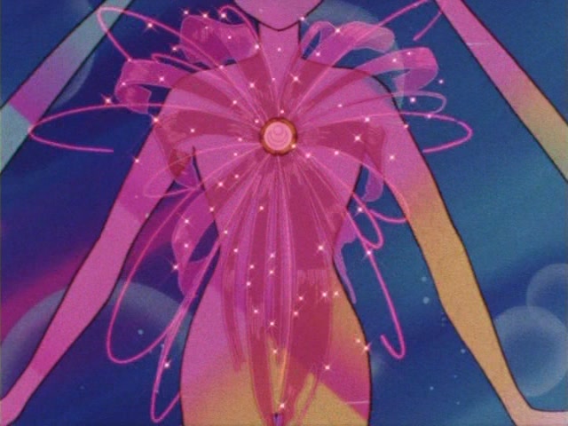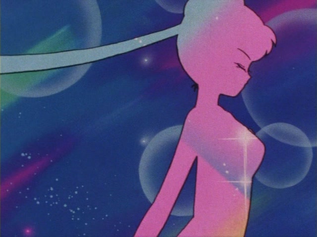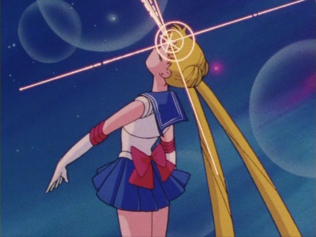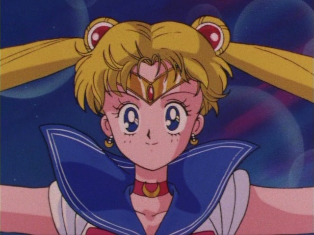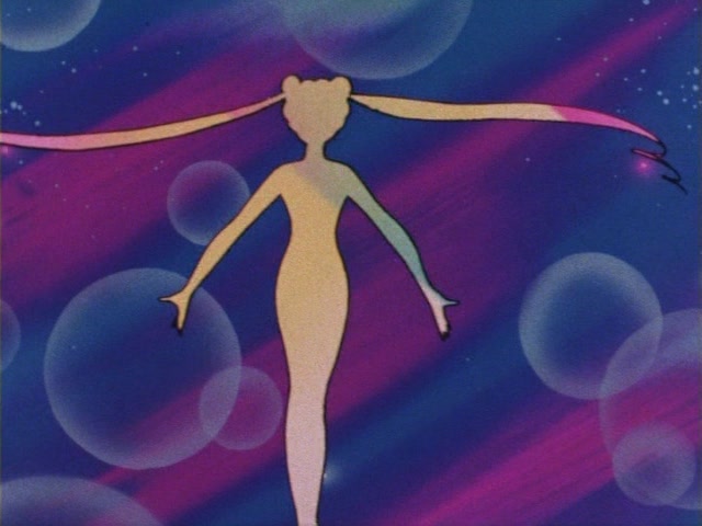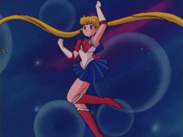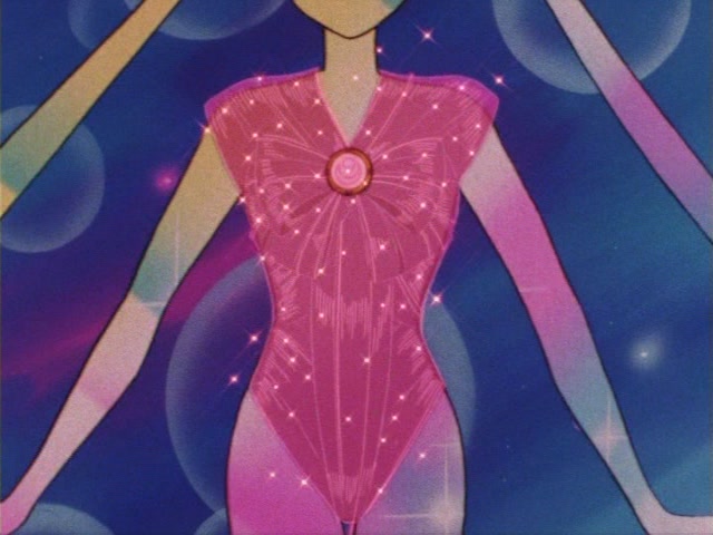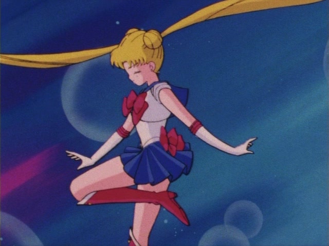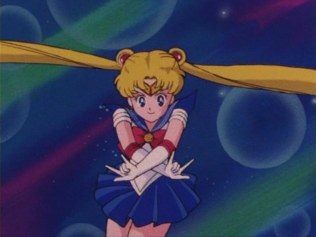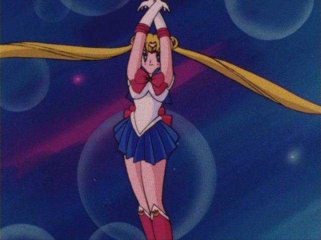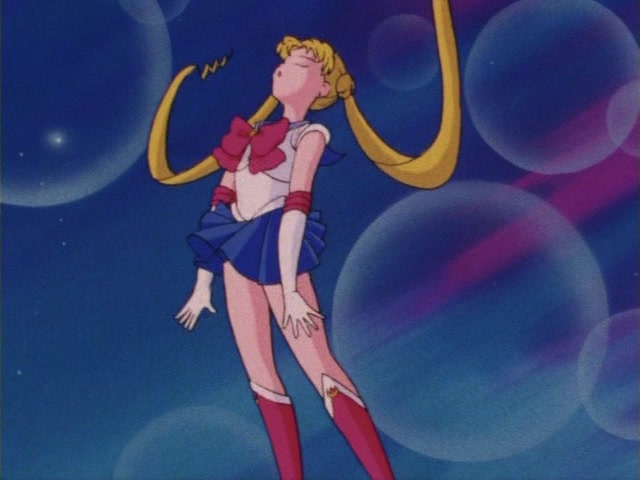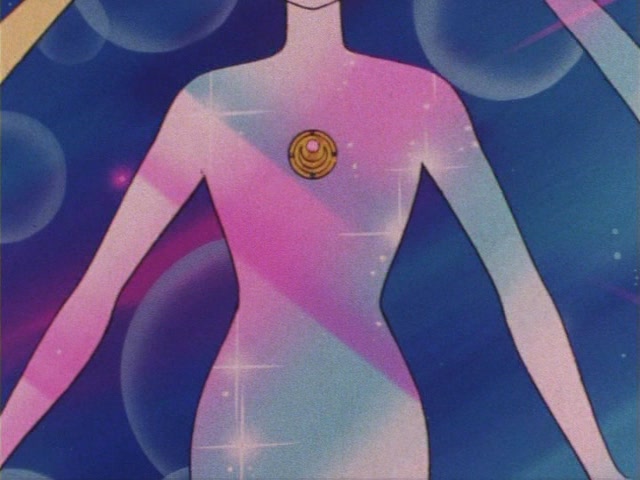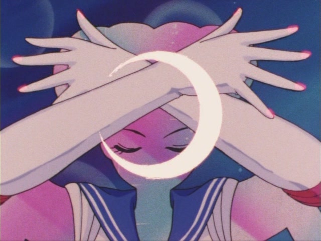 В аниме Усаги выкрикивает слова заклинания и поднимает вверх руку (начиная с 7 серии рука повернута к экрану внутренней стороной и показано, как под действием магии превращения ногти Усаги окрашиваются в блестящий розовый цвет). Глаза Усаги становятся ярко-синими (по-видимому, в обычной жизни они темные, как и у большинства японцев). Все тело охватывает яркое переливающееся розово-голубое сияние, показывают лишь его сверкающий силуэт, на котором выделяется только брошь золотого цвета. Усаги с закрытыми глазами несколько раз вращается на ярком сине-розовом фоне. Наконец тело оборачивают прозрачные розовые ленты, намечаются, а затем формируются трико, бант и воротник. Усаги поднимает вверх руки, на руках появляются прозрачные розовые ленты, преобразуясь в перчатки с налокотниками. Такие же ленты образуются и на ногах, превращаясь в сапоги. Сияние – и появляется синяя юбка с красным бантом. Усаги поднимает вверх одну ногу и продолжает вращаться, проделывая сложные "пируэты". Лоб освещает яркое сияние, появляются драгоценная диадема, сережки и украшения на оданго. Взмах руками и боевая стойка на фоне сверкающего полумесяца. Сейлор Мун готова к бою!