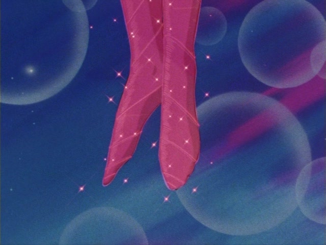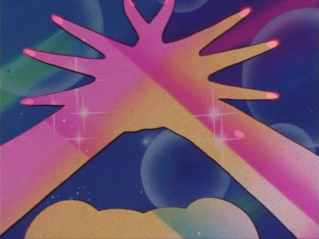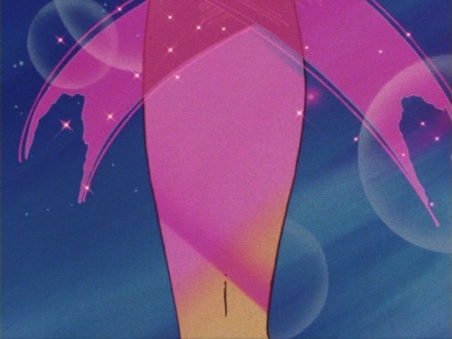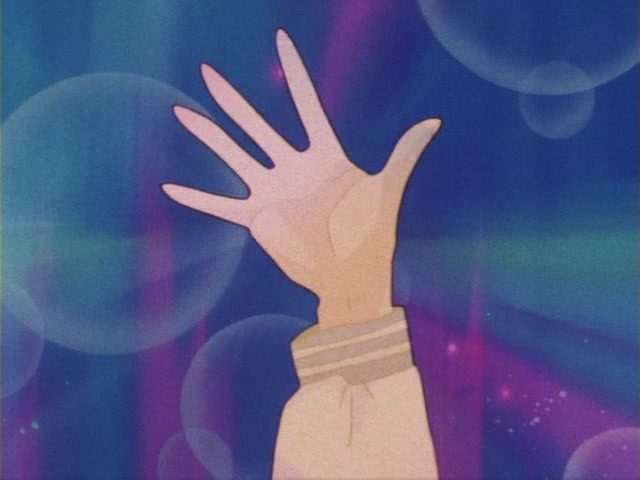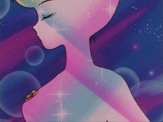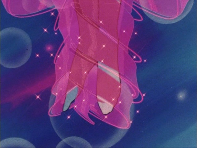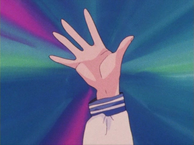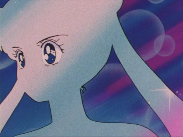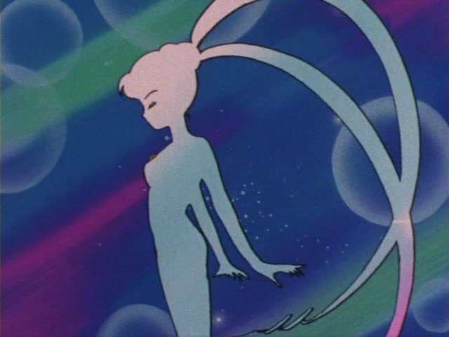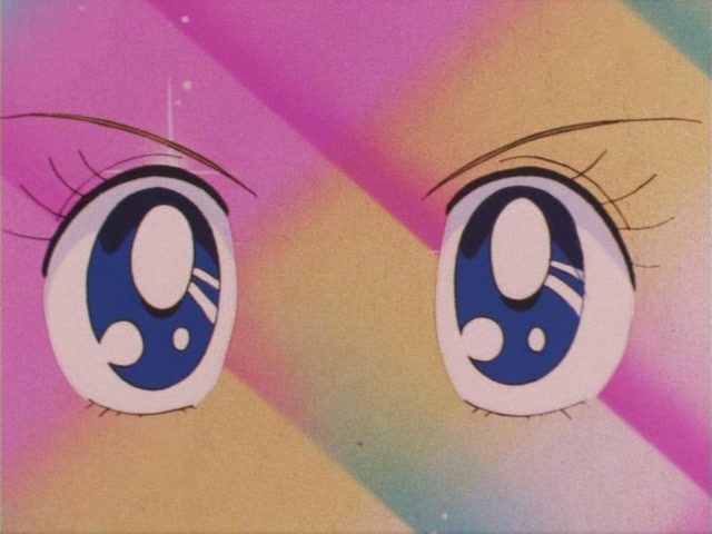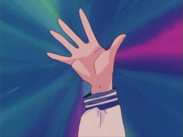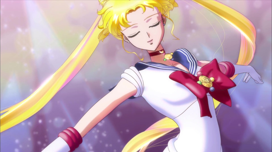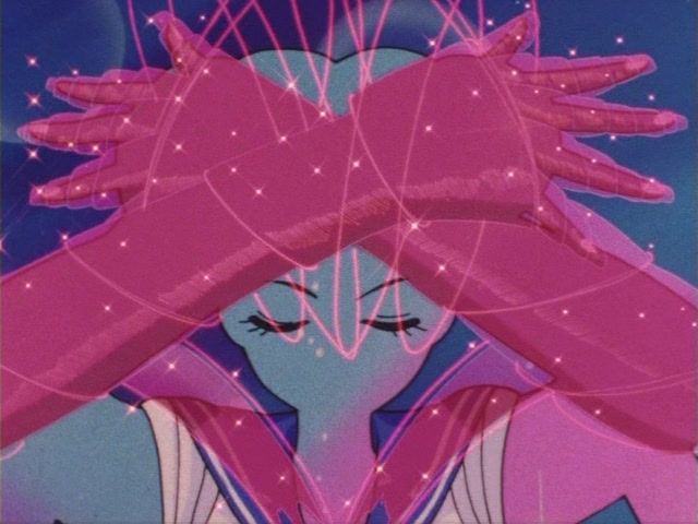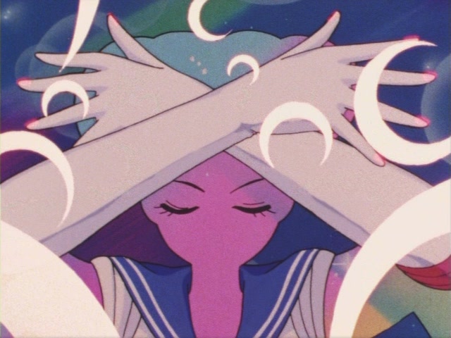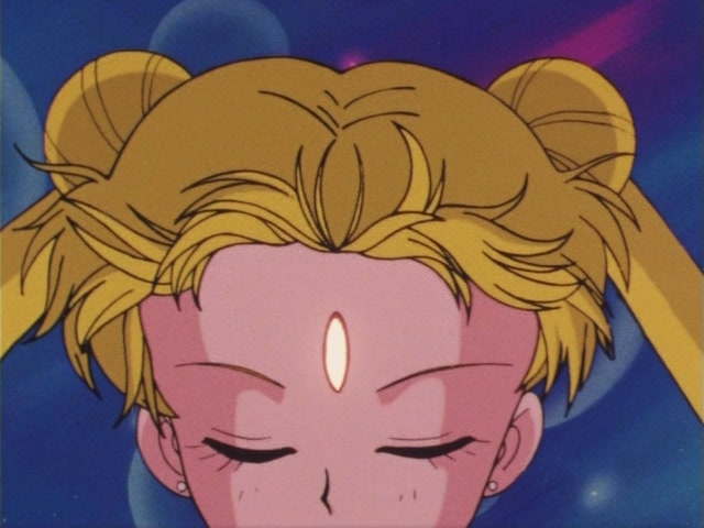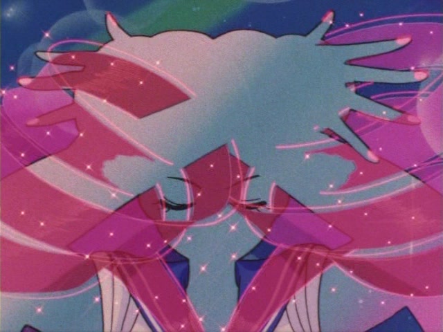В аниме Усаги выкрикивает слова заклинания и поднимает вверх руку (начиная с 7 серии рука повернута к экрану внутренней стороной и показано, как под действием магии превращения ногти Усаги окрашиваются в блестящий розовый цвет). Глаза Усаги становятся ярко-синими (по-видимому, в обычной жизни они темные, как и у большинства японцев). Все тело охватывает яркое переливающееся розово-голубое сияние, показывают лишь его сверкающий силуэт, на котором выделяется только брошь золотого цвета. Усаги с закрытыми глазами несколько раз вращается на ярком сине-розовом фоне. Наконец тело оборачивают прозрачные розовые ленты, намечаются, а затем формируются трико, бант и воротник. Усаги поднимает вверх руки, на руках появляются прозрачные розовые ленты, преобразуясь в перчатки с налокотниками. Такие же ленты образуются и на ногах, превращаясь в сапоги. Сияние – и появляется синяя юбка с красным бантом. Усаги поднимает вверх одну ногу и продолжает вращаться, проделывая сложные "пируэты". Лоб освещает яркое сияние, появляются драгоценная диадема, сережки и украшения на оданго. Взмах руками и боевая стойка на фоне сверкающего полумесяца. Сейлор Мун готова к бою!