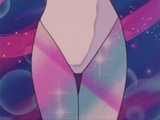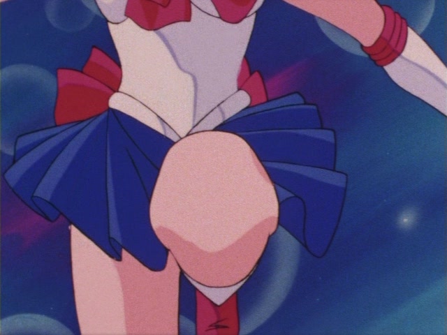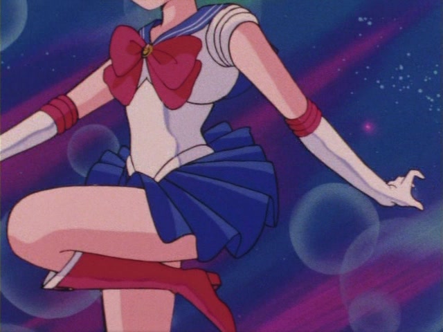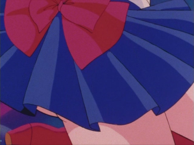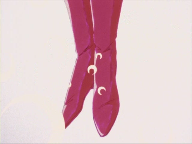 Высокие красные сапоги с белой каймой и желтым полумесяцем до колен; короткая синяя юбочка-плиссе (гармошкой); белый пояс; белое трико; красные банты на груди и за спиной; круглая брошь для превращений с полумесяцем, прикрепленная к банту на груди; красные налокотники; белые перчатки; синий воротник с двумя белыми поперечными полосками; красная ленточка с желтым полумесяцем на шее; серьги в форме полумесяца на ниточках из трех бусинок; золотая (?) диадема с красным камнем; красные с белыми гранями брошки-заколки на оданго.