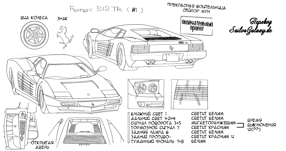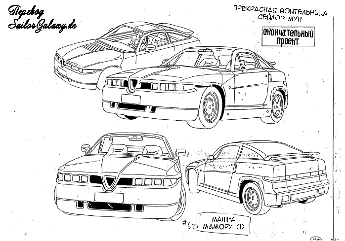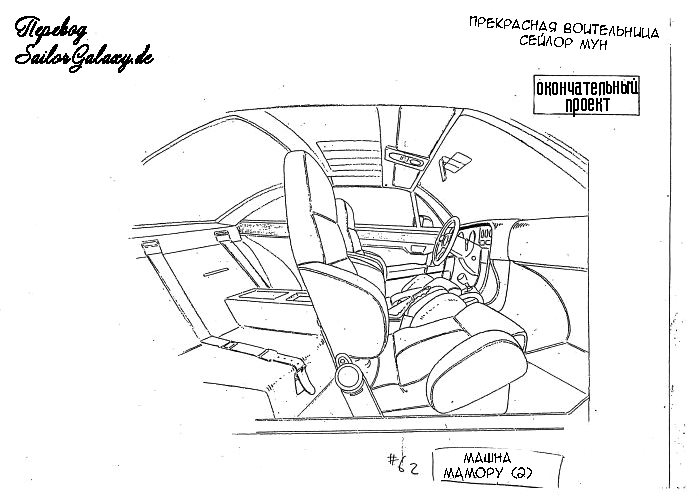 Машина: На роскошных машинах гоняли Нефрит (впервые он подъезжает на своем красном "Феррари" к теннисному корту, чтобы начать обработку первой жертвы) и Харука. Нечто менее шикарное было у отца Усаги - Кэндзи (он вывозил на своей машине семью на озеро) и Эдвиал - одной из ведьм Профессора Томоэ. В 6 серии именно на машине преследовали ёму Усаги и композитор Юсукэ Амадэ. В автокатастрофе погибли родители Мамору.