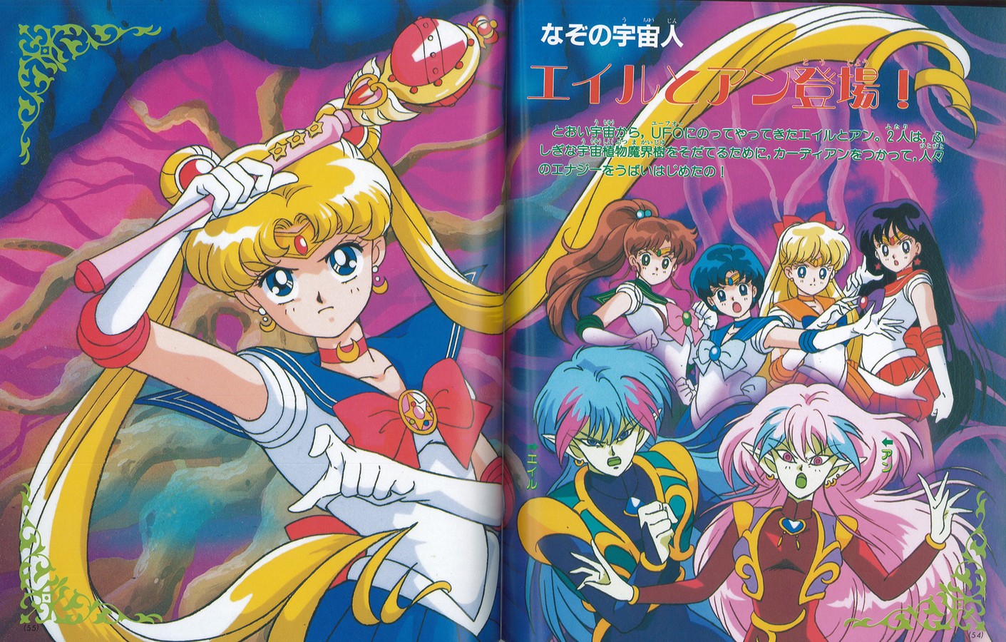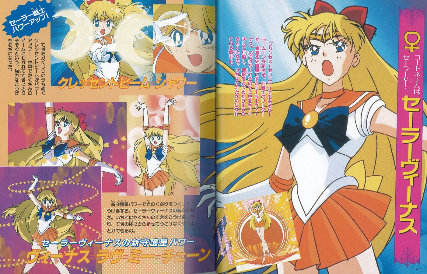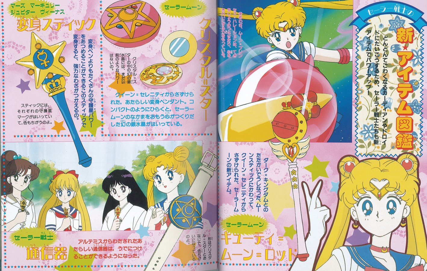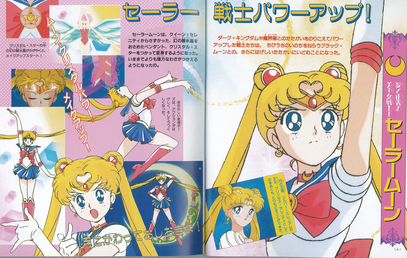 На первой странице читаем: «Битва с Черной Луной, которая охотится на Чиби Усу, началась! Мы расскажем секреты Воинов, получивших новые силы». Затем переворачиваем страничку, видим групповое изображение Усаги и её друзей, а еще через страницу наконец-то обещанный раздел о новых способностях Воинов. На каждого отведено по развороту (на Сейлор Мун - два), где нам показаны новые перевоплощения и всевозможные атаки Сейлоров. Как вы помните, во втором сезоне девочки два раза получали новые атаки. Ничего из этого забыто создателями альбома не было. Не обошли даже финальные позы перевоплощений, стилизованные под японскую живопись из 56-ой серии. Кроме того, отдельный разворот посвящен специальным items Сейлоров: новому жезлу Сейлор Мун, её новой брошке, а также новым ручкам для перевоплощений и коммуникаторам подруг. Еще две страницы посвящены Мамору. Много места уделяется разрыву Мамору с Усаги во втором сезоне.