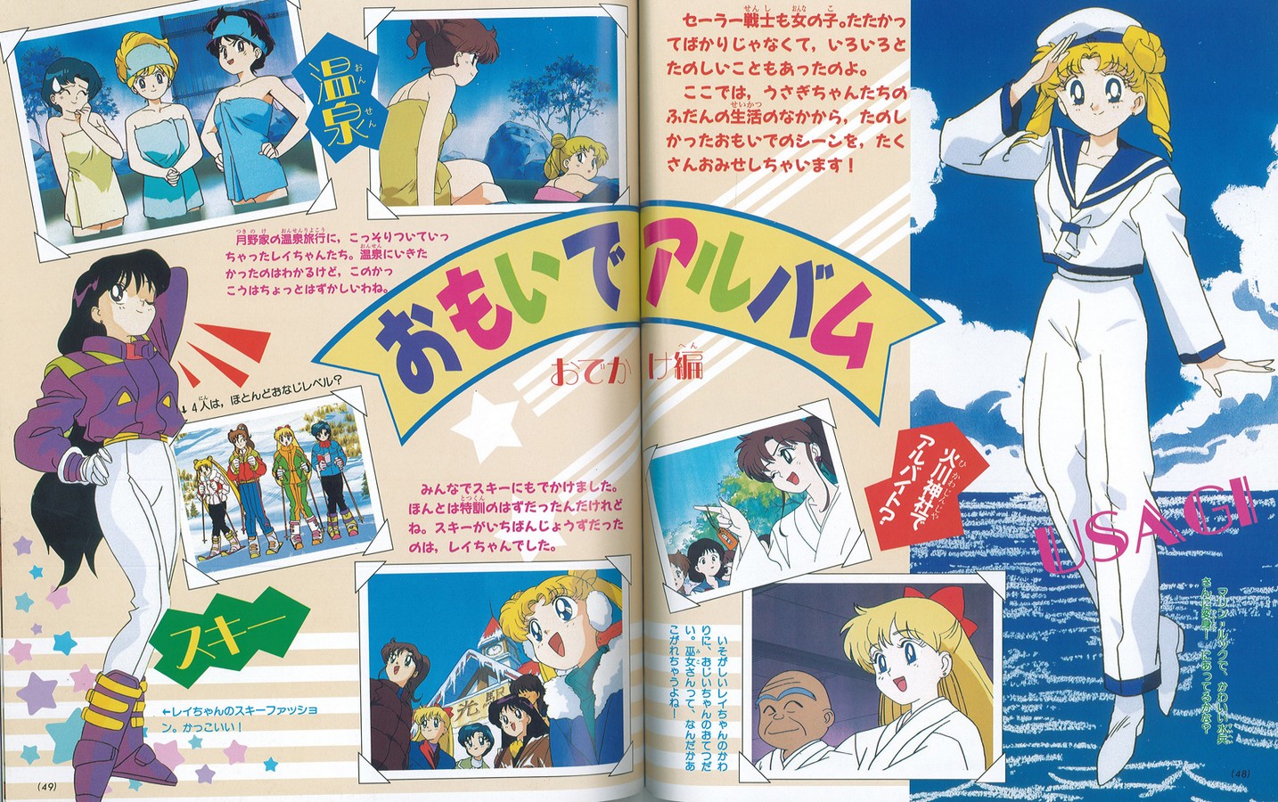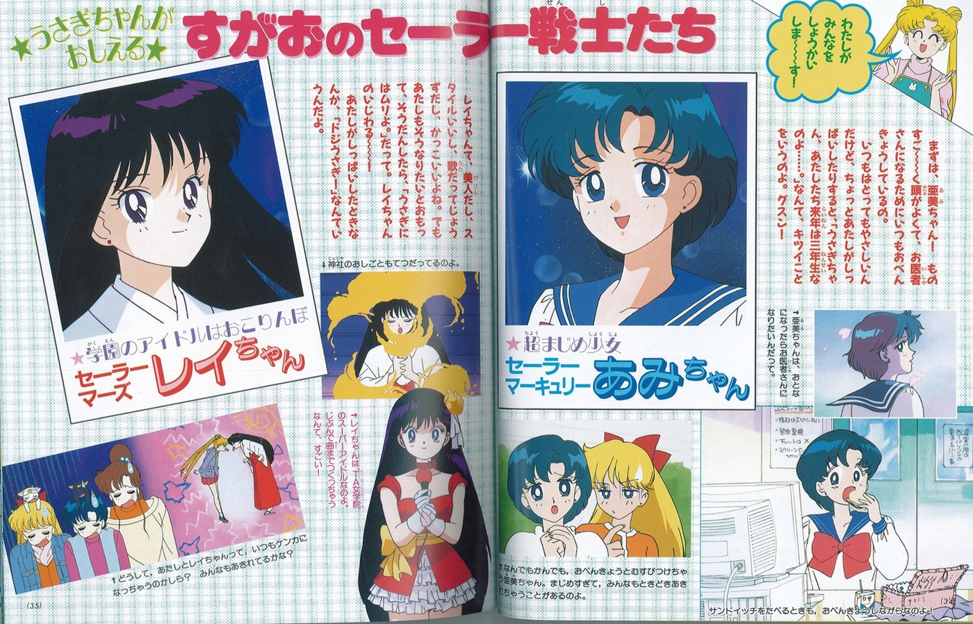 Следом расположен традиционный блок про обычную жизнь девочек «Сейлор Воины без грима». Вначале обо всех рассказывает Усаги. Например, об Ами: «Начну с Ами-тян! Она ооооочень умная и все время занимается, потому что хочет стать врачом. Еще она всегда очень добрая, но когда я получаю плохие оценки, она говорит жестокие вещи вроде: «Усаги-тян, мы ведь в будущем году перейдем в третий класс!»». Усаги не перестает удивляться тому, что её подруга занимается даже тогда, когда ест сэндвичи! А вот про Рэй: «Рэй-тян и красивая, и стильная, и даже поет хорошо, и вообще классная! Но когда я, желая стать такой же, советуюсь с ней, она говорит: «Тебе, Усаги, это не под силу». Рэй-тян – вредина!!! А когда у меня неуспеваемость, она говорит что- то вроде: «Дурочка Усаги!»». Примечательно, что Усаги, не переставая ссорится со своей самой вредной подругой, старается рассказывать о ней объективно и даже восхищаться ей. О Макото Усаги отзывается очень хорошо, но советует быть ей осторожнее в применении силы. Досталось и Минако: Усаги говорит, что та обладает чертами характера милой глупышки, часто путает пословицы и, вообще, очень похожа на неё, Усаги. А это высказывание о котах: «Наши важные друзья, Луна и Артемис. Хотя они кошки, они хорошо умеют говорить и объясняют нам разные вещи. Но эта Луна быстро злится на меня, а Артемиса она и вовсе отвергла!» Все эти рассуждения Усаги сопровождаются компрометирующими фотографиями, что даже привело в негодование некоторых девочек и заставило пустить ручьи слез Луну: «Эмм…По-послушай, тут сплошные фотографии, за которые стыдно!» Лишь Минако не растерялась и сказала: «А теперь мы представим Усаги!»