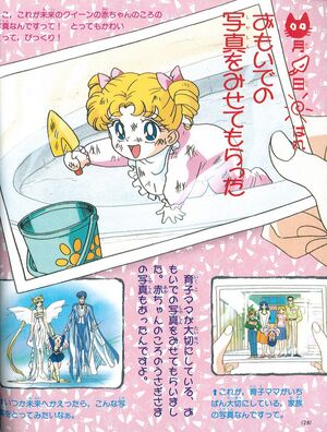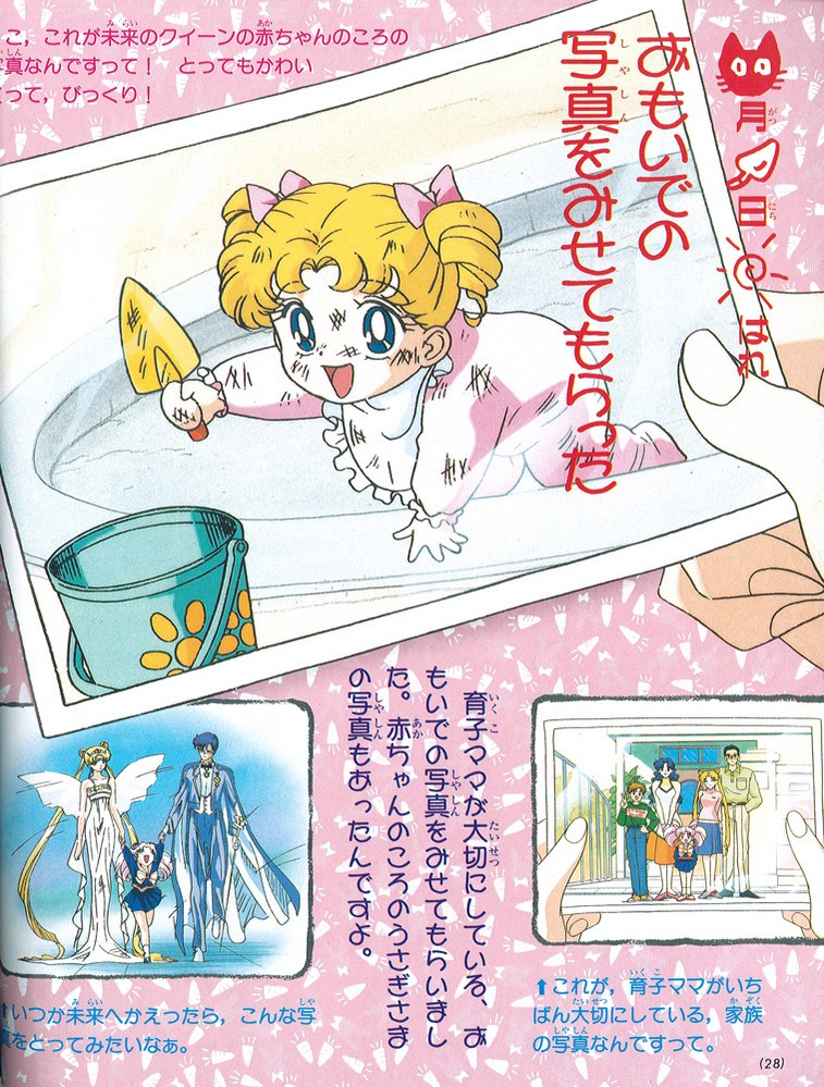 Также традиционный раздел. На этот раз он называется «Дневник наблюдения Дианы за Сейлор Воинами». Сюда были занесены все сведения, изученные этой усердной маленькой кошечкой. В первую очередь она акцентировалась на Усаги, Мамору и Чиби Усе, но о девочках тоже кое-что имеется. Как всегда, очень вежливо, Диана рассказывает нам обо всем, что видит и думает о своих близких: отмечает то, как прилежно занимаются «Мамору-сама» и Ами-тян, как старается Юная Леди, и как «Усаги-сама», вместо того, чтобы тоже заниматься, – ревнует и злится. Диана не могла не заметить, что её хозяйка постоянно думает о ком-то, поэтому предполагает, что у Юной Леди, скорее всего, появился возлюбленный. Кстати, кошечка отмечает, что мечты о свадьбе присутствуют в душе каждой девочки. На это она говорит, что влюбленные девушки – это ужасно. Как примерной и воспитанной, Диане не нравятся проделки Усаги: «Усаги-сама специально оделась как ниндзя, чтобы проникнуть в комнату Рэй-сан! Вот что творит будущая королева»! А вот фотографии Усаги от мамы Икуко Диану растрогали: «Мама Икуко показала памятные фотографии, которые она бережно хранит. Там была и фотография Усаги-сама, где она еще малышка. Э…это фотография будущей королевы в младенческом возрасте! Какая милая, удивительно»! Страницу с фотографиями вы можете видеть рядом. Кстати, для описания своих чувств Диана делает пометки в виде зарисовок: «ясно», «облачно», «дождливо», - прямо как Усаги в одном из R-«Делюксов»!