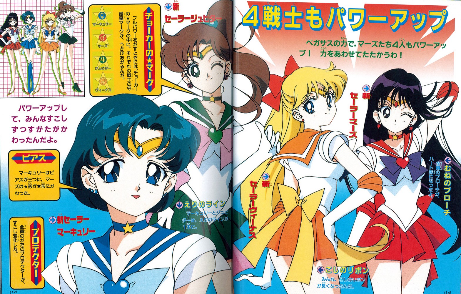 На четырех подруг Усаги отведен всего разворот, но и тут дается анализ того, как изменились Воительницы, а точнее их костюмы: у всех Воинов броши стали в форме сердца, ленты на поясе стали длиннее, когда Воительницы выдают максимум силы, внутри «звездочки» на колье появляется знак планеты-хранителя каждого из воинов. У Меркурий и Юпитер стало по одной полосе на воротниках. У Сейлор Меркурий стали тройные серьги, у Сейлор Марс с пятиконечных звезд изменились на шестиконечные. Кроме того, немного изменились наплечники.