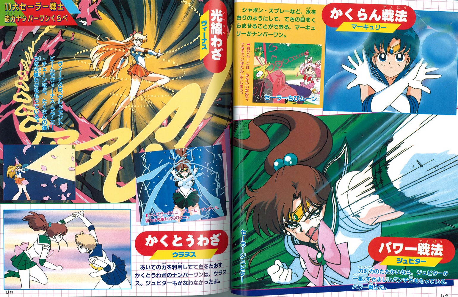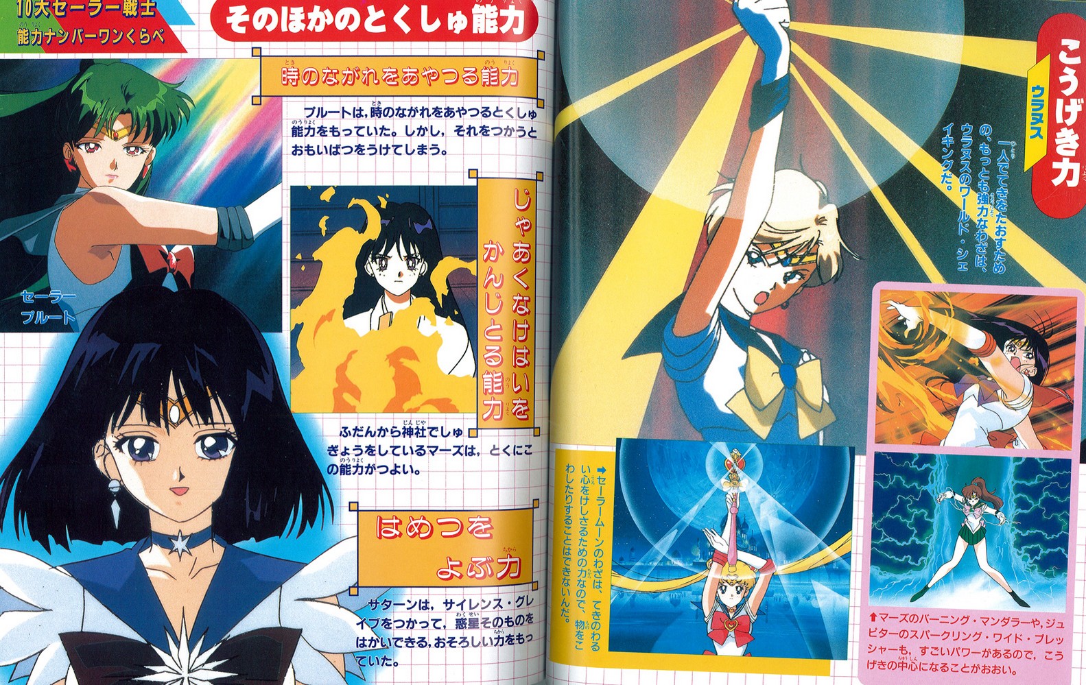 Далее идет рубрика «Сравнение лучших способностей 10 Сейлор Воинов». Так как со стороны посетителей сайта были просьбы поподробнее о ней рассказать, я так и поступлю. Рубрика с многочисленными картинками и подписями сравнивает 10 Воительниц по 10-ти параметрам. Как правило, под каким-либо критерием сразу же пишется имя выдающейся по нему Воительницы (реже нескольких), но затем еще указывается, какие Воительницы тоже имеют очень хорошие показатели по данному пункту. Ниже вы можете прочитать перевод из книги:
