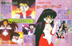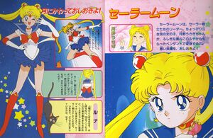Разворот стр 6-7 полностью посвящен Сейлор Мун. Здесь она делится с нами своими впечатлениями о ёмах, с которыми ей приходится сражаться, также уделено внимание костюму воительницы и её первой помощнице – кошке Луне. Следующий разворот – это демонстрация атак Сейлор Мун. Мы можем наблюдать за действием лунного жезла и тиары. При этом упоминается, что тиара может не только рассекать врагов, но и посыпать заколдованных людей звездной пылью.