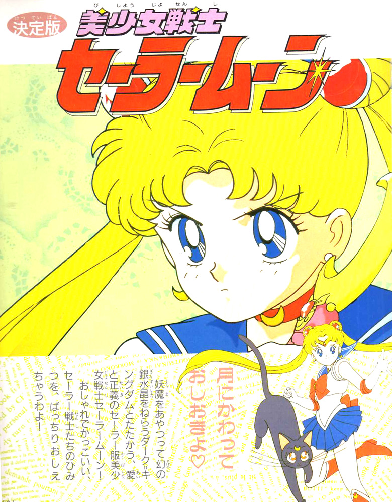 Открыв первую страничку, мы можем видеть Сейлор Мун крупным планом и надпись: «Я несу возмездие во имя луны!» - и дальше: «Сэйлор Мун сражается с Темным Королевством, охотящимся за Серебряным Кристаллом иллюзий, посредством любви и справедливости, при этом с легкостью расправляясь с ёмами. Секреты сногсшибательных Сейлор Воительниц сейчас будут должным образом вам поведаны».