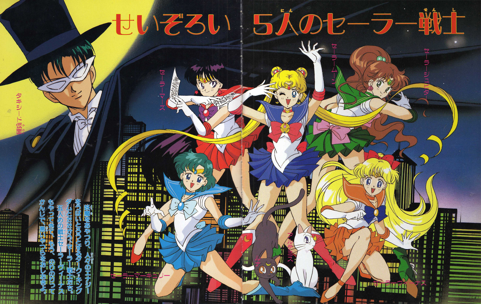 Новый разворот содержит групповую зарисовку пяти воительниц и двух котов, а также Таксидо Камэна поодаль. Все изображены на фоне ночного города. Картинка поистине впечатляющая!