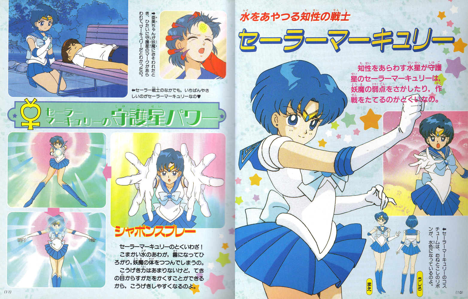 Следующие две страницы отведены для Сейлор Меркурий. Поговорили немножко про то, как гениальна Ами, какой у неё костюм, какая она милая. Упоминается также о том, как Луна заподозрила в ней ёму (а затем и воительницу). Полстраницы отведено для описания её первой атаки Shabon Spray. Причем упоминается, что это слабая атака, но которая имеет свои плюсы, благодаря чему Сейлор Меркурий удается ускользать от врагов.