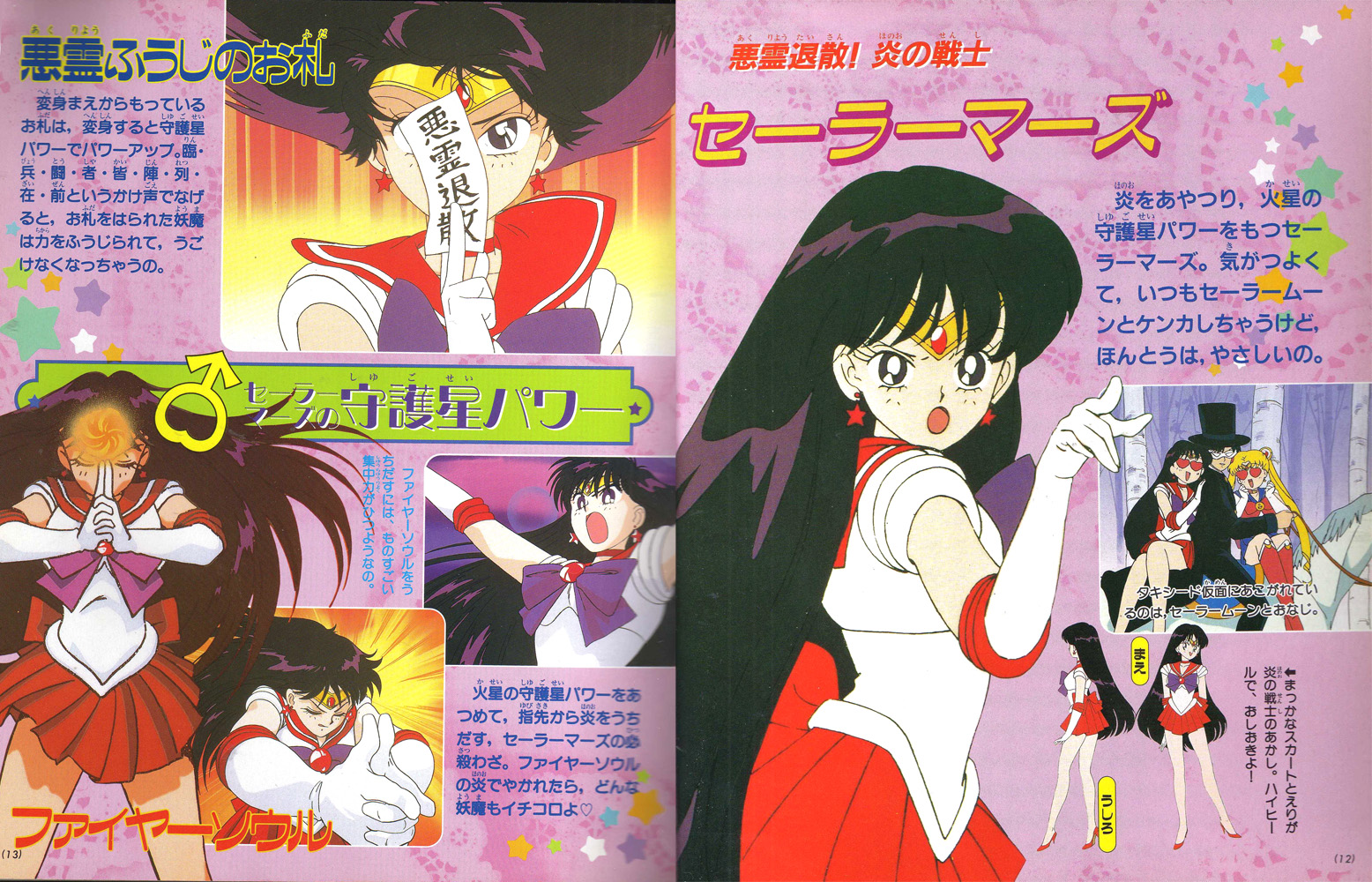 Переворачиваем страничку и оказываемся в рубрике, посвященной Сейлор Марс. Здесь раскрываются самые нелицеприятные аспекты этой воительницы: «Приручившая огонь и имеющая силу Марса-покровителя Сэйлор Марс. Её характер суровый, и оттого она постоянно ссорится с Сейлор Мун...» и «Её красные юбка и воротник забавляют, но будь осторожен, она накажет тебя каблуком!» Конечно же, упоминается, что Марс подобно воительнице луны влюбилась в Таксидо Камэна. Атаки Марс тоже не были обойдены. Им отводится тринадцатая страница.