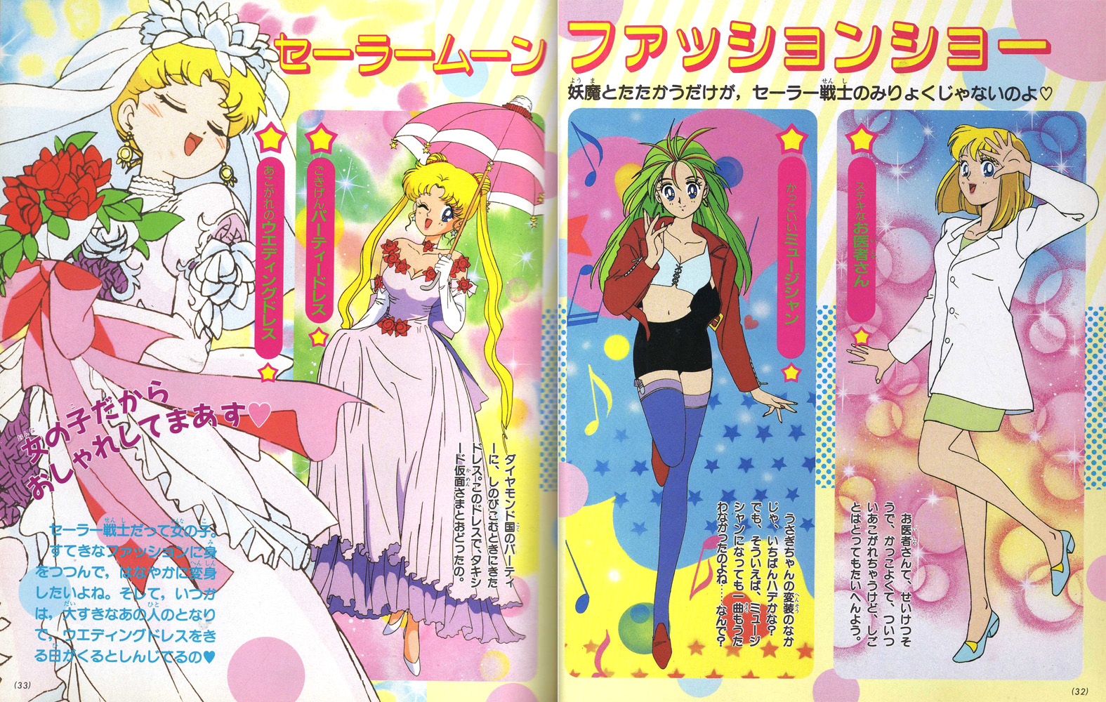 Разворот 32-33 знакомит нас со всеми чудесами ручки для перевоплощений, которую дала Усаги Луна. Здесь перед нашим взглядом предстают изображения Усаги в виде врача, рок-певицы, великосветской дамы и невесты – в общем, это только некоторые образы, которые принимала Усаги испытывая на себе чары волшебной ручки.