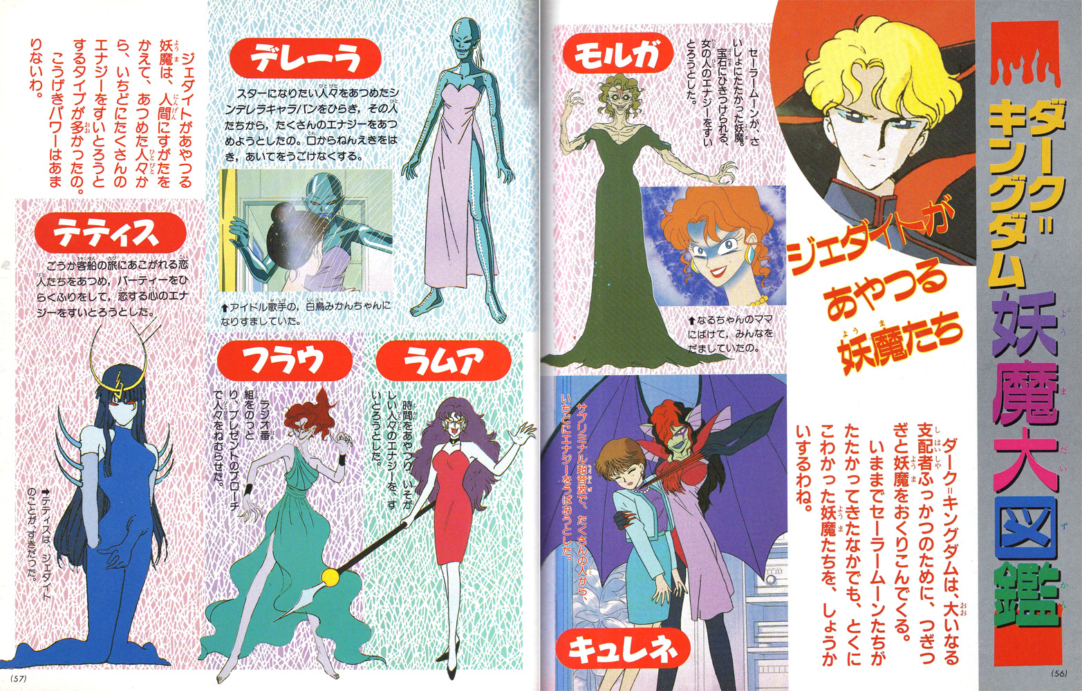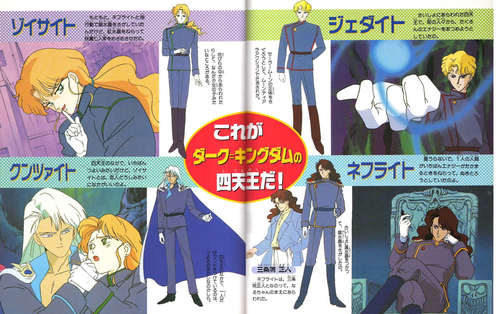 Темное Королевство тоже не осталось обойденным. Раздел, посвященный ему, начинается с 52 страницы. На первом же развороте нам дают краткую характеристику Королевы Берилл и Небесных Королей, а также рассказывается о том, кто такие ёмы. Разворот 54-55 целиком и полностью отведен под информацию о Четырех Небесных Королях. Здесь не забыли упомянуть, как Жадеит воровал энергию у людей, как Нефрит пошел иным путем и изобрел Черный Кристалл, упоминается и о нем, как о Масато Сандзёине. На страницах журнала не обошли и «странную» любовь Кунцита и Цоизита. Немного сказано и о костюмах Четырех Королей. Например, упоминается, что ношение Кунцитом плаща – это привилегия, которой пользуется только он.