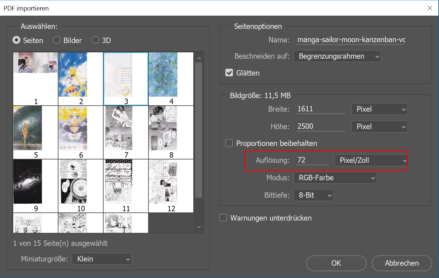- Открой PDF файл в программе Photoshop (далее - Фотошоп). Выбери одну страницу, которую ты собираешья редактировать, кликни на нее. В настройках справа обязательно впиши "72" в строчку "Разрешение", иначе изображение будет не адаптировано для просмотра онлайн.
