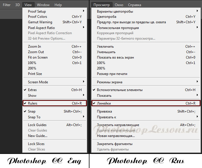 если номер страницы - трехзначное число, оставь наименование как есть. Пример: manga-sailor-moon-kanzenban-rus-volume-09-act-50-129 - Но прежде чем вставлять текст, нам нужно отредактировать изображение - очистить скан, спрятать японский текст... Для начала проверь, прямо ли расположен скан. Бывает, что страница была сосканирована криво. Чтобы это проверить и, если необходимо, исправить, включи отображение Линеек. Для этого кликни на пункт меню "Просмотр" и в выпавшем меню кликни на "Линейки":