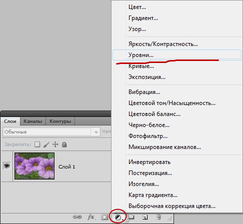 - Теперь нужно сделать скан белым и чистым, чтобы он соответствовал белому слою, который мы под него подложили. Выбеливание скана также помогает устранить огрехи скана, как, например, просвечивающие очертания кадров с другой стороны страницы. На картинке сверху это очень хорошо видно внизу скана - пустое место не ровно серое, там, к сожалению, проглядывают кадры с оборотной стороны страницы манги. Чтобы это исправить, клинки на иконку с наполовину закрашенным кругом (иконка расположена под списком слоев), и в выпавшем меню выбери "Уровни":