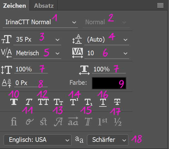 - Автоматическое расстояние между буквами - обычно для всех текстов мы рекомендуем настройку "оптически". Только для нашего стандартного шрифта IrinaCTT Normal мы рекомендуем здесь настройку "метрически".